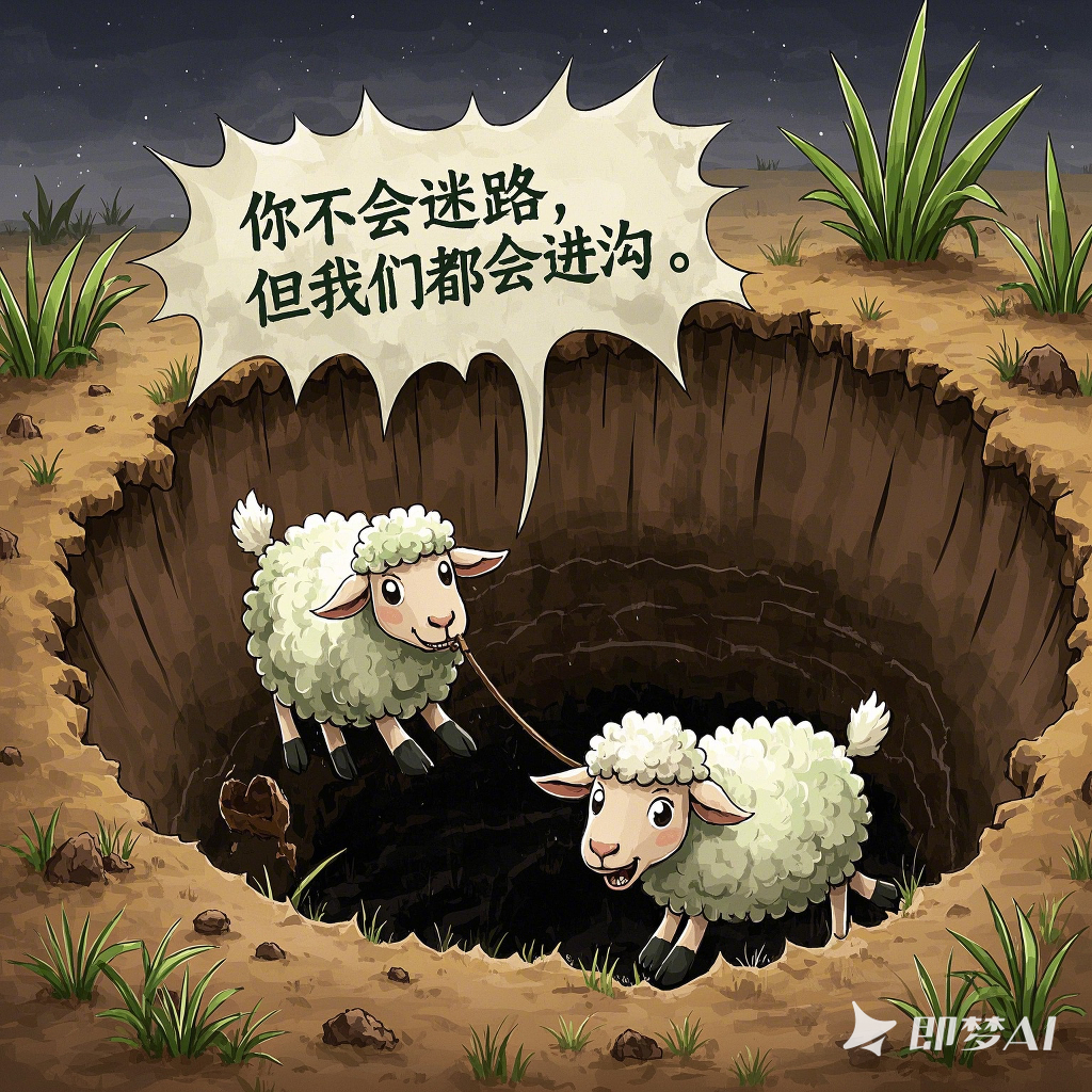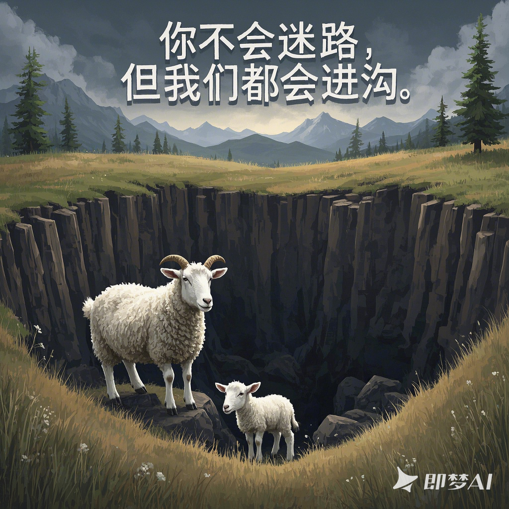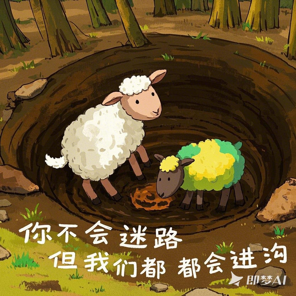 提示词:一只羊牵着另一只羊,结果掉进坑里,配文:“你不会迷路,但我们都会进沟。”提示词:一只羊牵着另一只羊,结果掉进坑里,配文:“你不会迷路,但我们都会进沟。”提示词:一只羊牵着另一只羊,结果掉进坑里,配文:“你不会迷路,但我们都会进沟。”