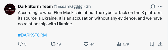 据界面新闻,当地时间3月10日,社交媒体平台X出现故障,马斯克称X受到大规模网络攻击,“IP源头是乌克兰”。3月11日,黑客组织Dark Storm Team在社交媒体上暗示对X平台遭受攻击负责,并表示:“马斯克的指控没有任何证据,我们与乌克兰没有任何关系。”据悉,Dark Storm Team是一家亲巴勒斯坦的黑客组织。