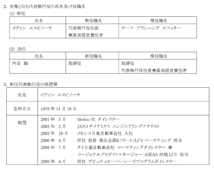 据界面新闻,日产汽车3月11日宣布,公司当日召开董事会会议,决定社长内田诚将于3月底卸任,继任者为公司首席规划官伊万·埃斯皮诺萨(Ivan Espinosa),4月1日起生效。