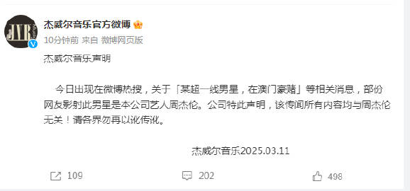 据红星新闻,3月11日,@杰威尔音乐官方微博 发布声明:今日出现在微博热搜,关于「某超一线男星,在澳门豪赌」等相关消息,部份网友影射此男星是本公司艺人周杰伦。公司特此声明,该传闻所有内容均与周杰伦无关!请各界勿再以讹传讹。
