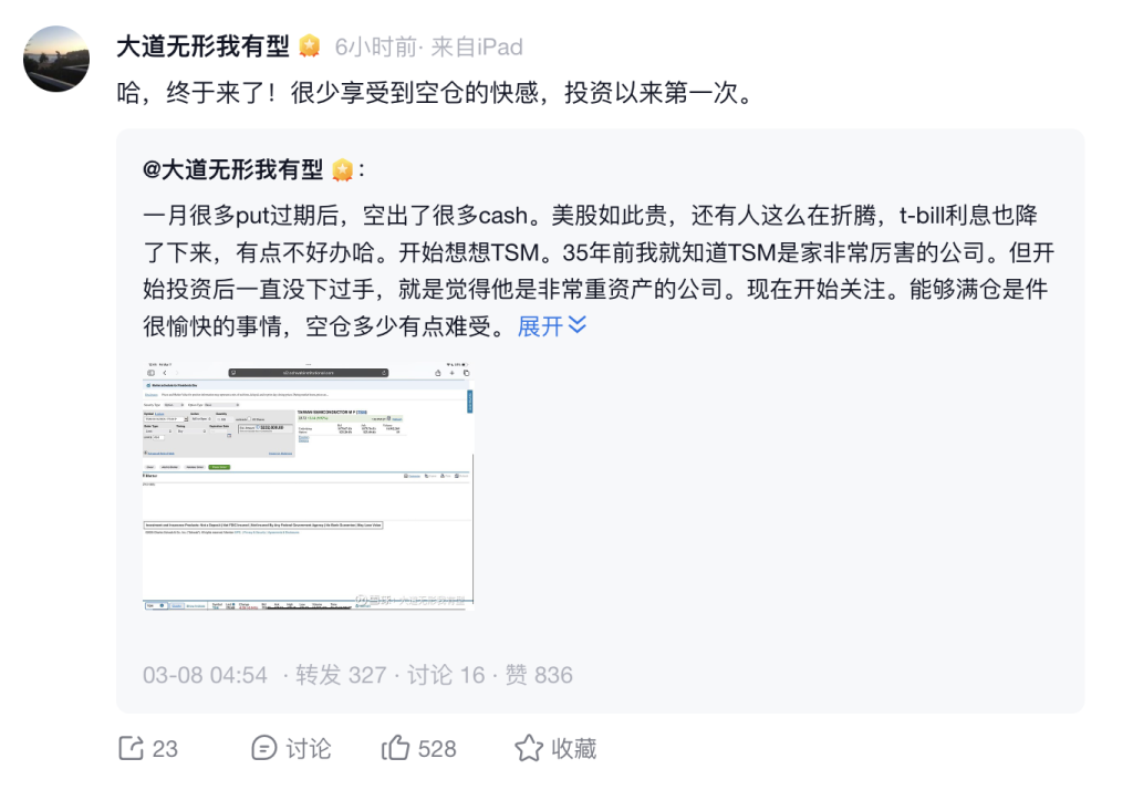 对此,段永平3月11日在其雪球账号“大道无形我有型”的主页上感慨:“哈,终于来了!很少享受到空仓的快感,投资以来第一次。”