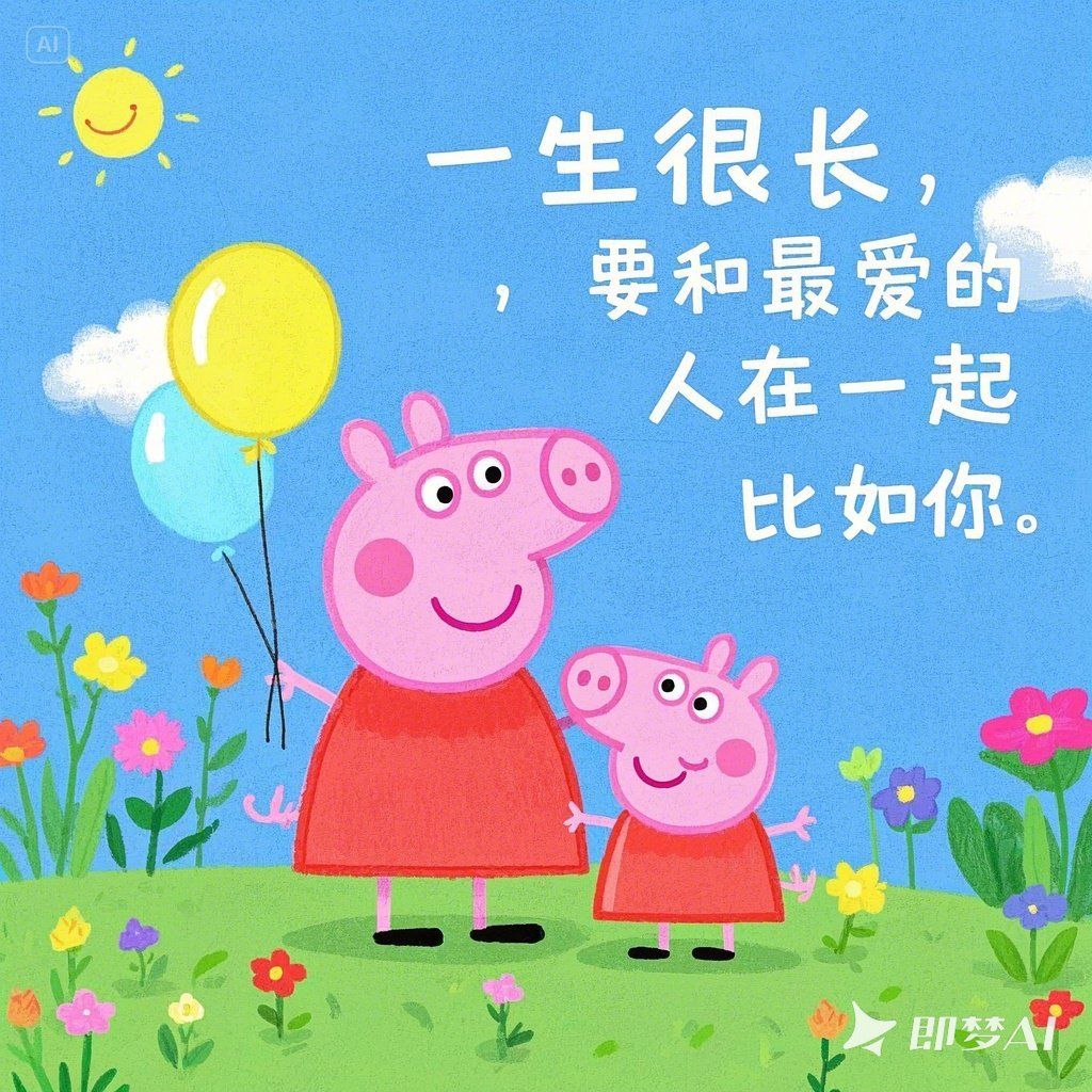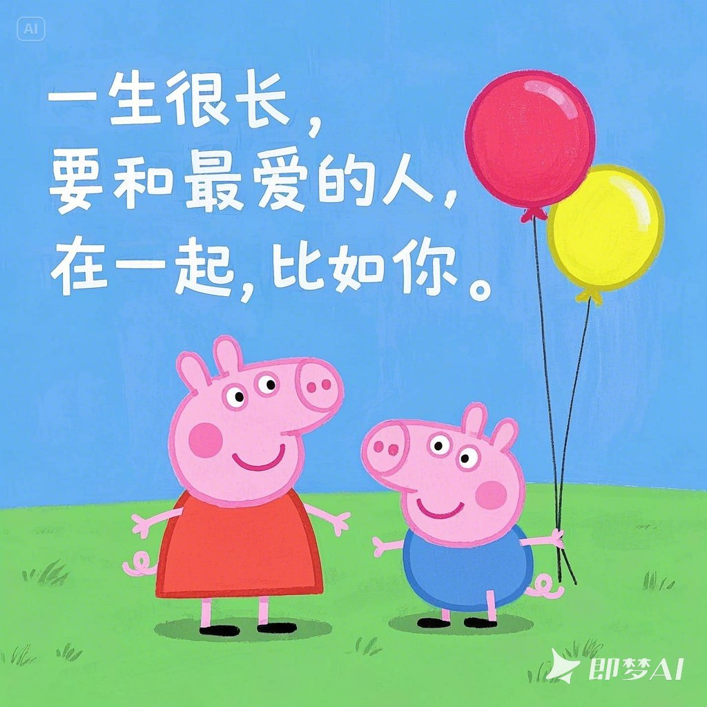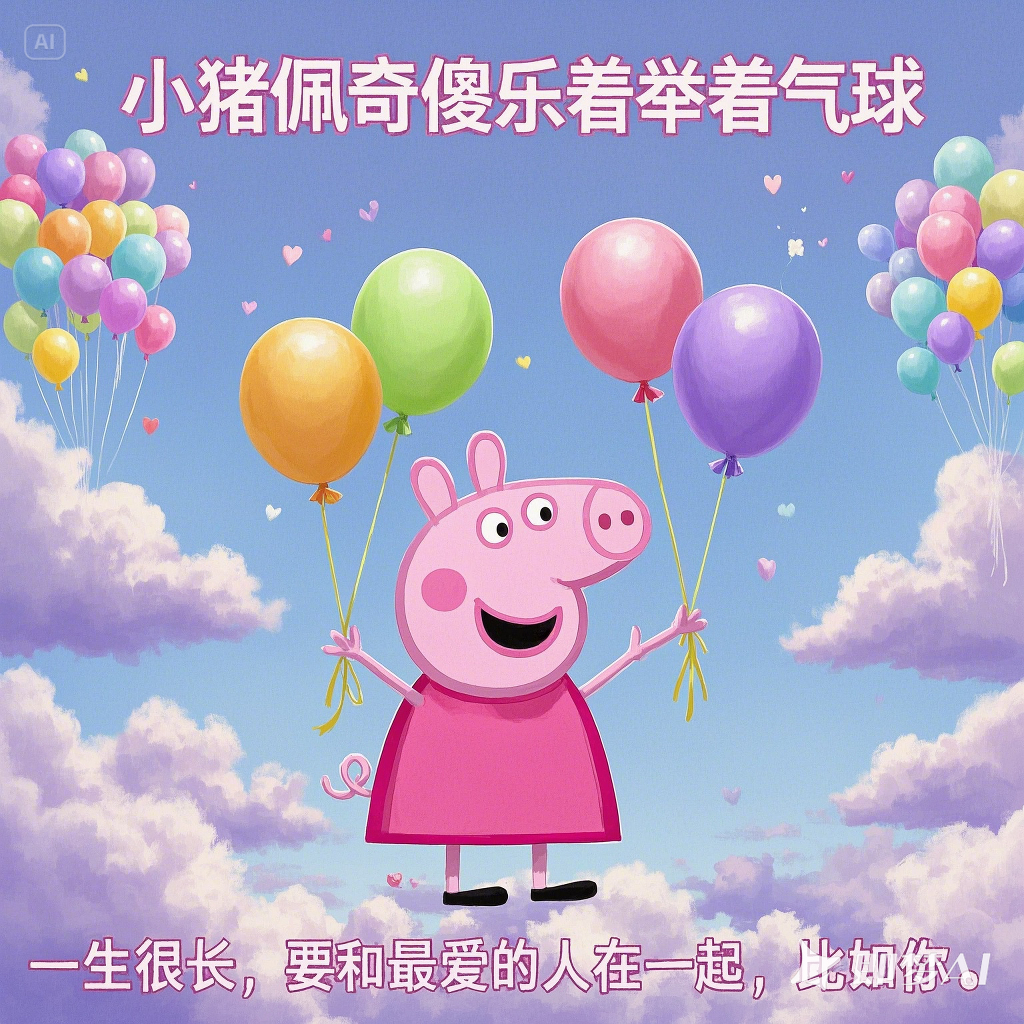 提示词:小猪佩奇傻乐着举着气球,画风特别甜 文案搭配:“一生很长,要和最爱的人在一起,比如你。”