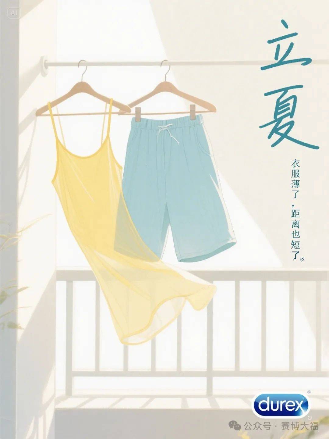 Durex海报,极简现代插画风格,两件夏季轻薄衣物悬挂在并排的衣架上,一件为黄色吊带背心,一件为浅蓝色男士短裤,两者彼此靠得非常近,衣角飘扬触碰,背景为明亮柔和的阳台空间,色调以奶油白、柠檬黄、薄荷蓝为主,阳光透过窗帘洒入,整体画面简洁、暧昧、富有隐喻感,画面文案“立夏”、“衣服薄了,距离也短了”,Durex logo,构图留白。