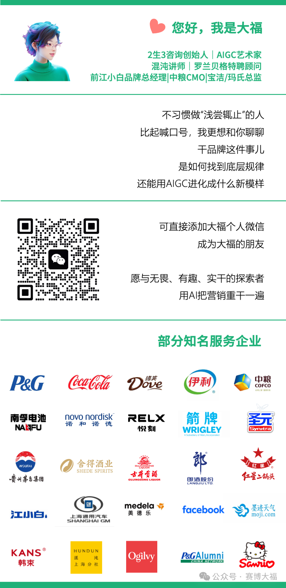 谢谢你看我的文章,期待你随手点赞、在看、转发三连!也期待你的关注,大福将持续更新自己在品牌营销领域的AI思考和实践,超干货!