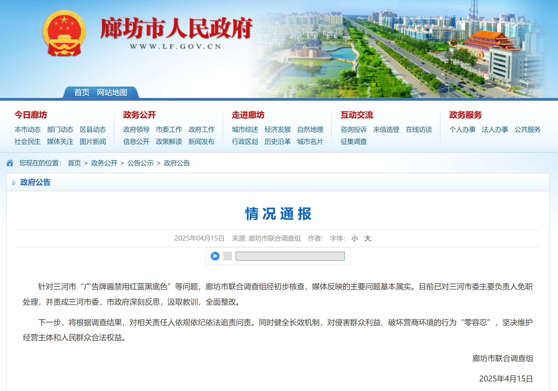据央视网,廊坊市人民政府网站消息,廊坊市联合调查组发布情况通报。针对三河市“广告牌匾禁用红蓝黑底色”等问题,廊坊市联合调查组经初步核查,媒体反映的主要问题基本属实。目前已对三河市委主要负责人免职处理,并责成三河市委、市政府深刻反思,汲取教训,全面整改。