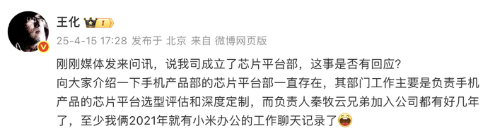 据界面新闻,4月15日,有消息称,小米在手机产品部组织架构下成立芯片平台部,任命秦牧云担任芯片平台部负责人。对此,小米集团公关部总经理王化在微博回应称,“向大家介绍一下手机产品部的芯片平台部一直存在,其部门工作主要是负责手机产品的芯片平台选型评估和深度定制,而负责人秦牧云兄弟加入公司都有好几年了,至少我俩2021年就有小米办公的工作聊天记录了”。