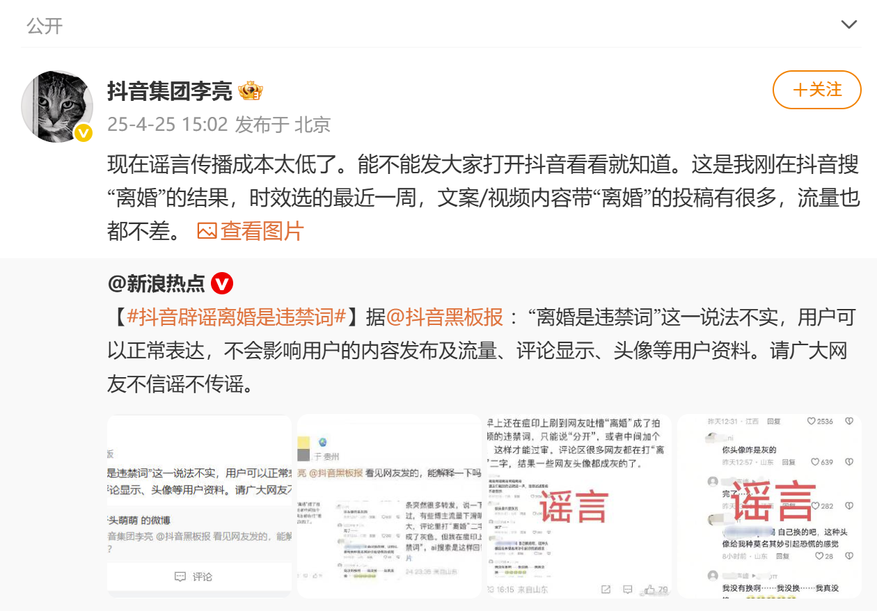 随后,抖音集团副总裁@抖音集团李亮 发文回应:现在谣言传播成本太低了。能不能发大家打开抖音看看就知道。这是我刚在抖音搜“离婚”的结果,时效选的最近一周,文案/视频内容带“离婚”的投稿有很多,流量也都不差。
