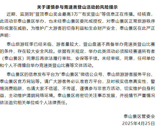 据中国新闻周刊,4月25日上午,泰山风景区发布《关于谨慎参与竞速类登山活动的风险提示》,内容如下:近期,监测到“登顶泰山奖金最高3万”“有奖登山”等信息正在传播。经核查,此活动非泰山景区举办,也未经泰山景区委托或授权,对泰山景区正常旅游秩序形成潜在威胁。泰山景区声明称,旅游旺季已经来临,游客量较大,登山盘道不具备举办竞速类登山比赛的条件,存在较大安全风险。未经审核、同意,任何单位和个人不得擅自举办竞速类登山比赛等文体活动。泰山景区将密切关注事态发展,并视情节严重情况依法追究相关单位或个人法律责任。