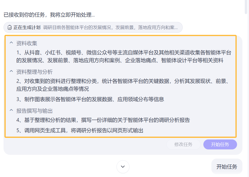 可以看到它规划的调研步骤,如果有需要修改的就点击修改即可,如果不需要就立即执行。