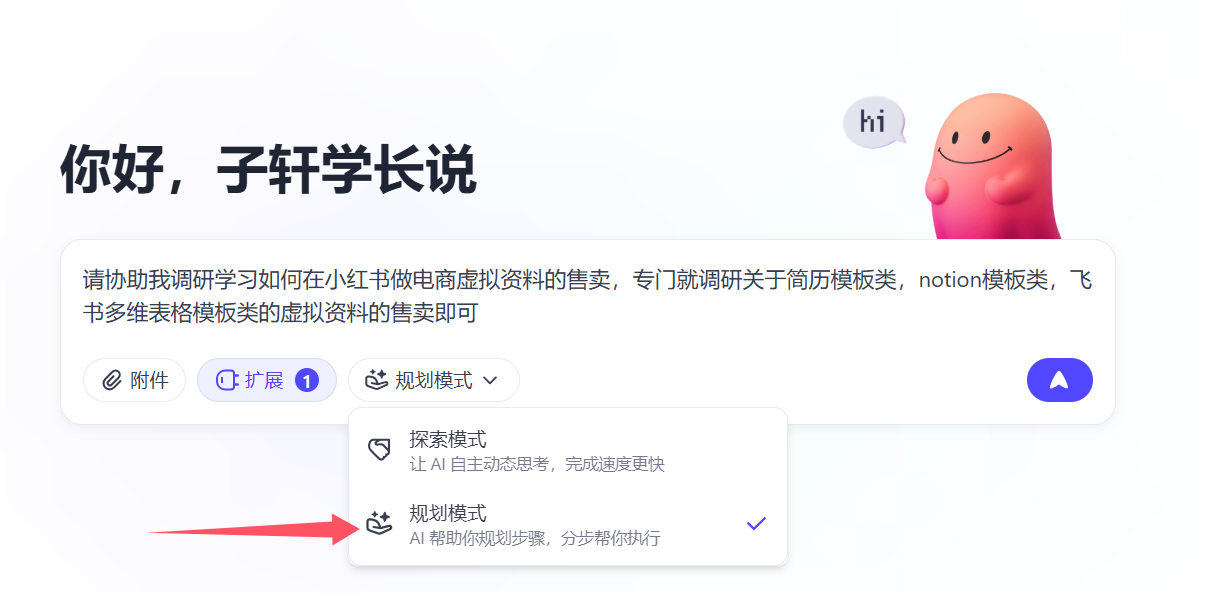 然后输入提示词,选择规划模式,一般复杂的问题我都会选择规划模式,我需要知道它的调研过程是否满足我的需要。