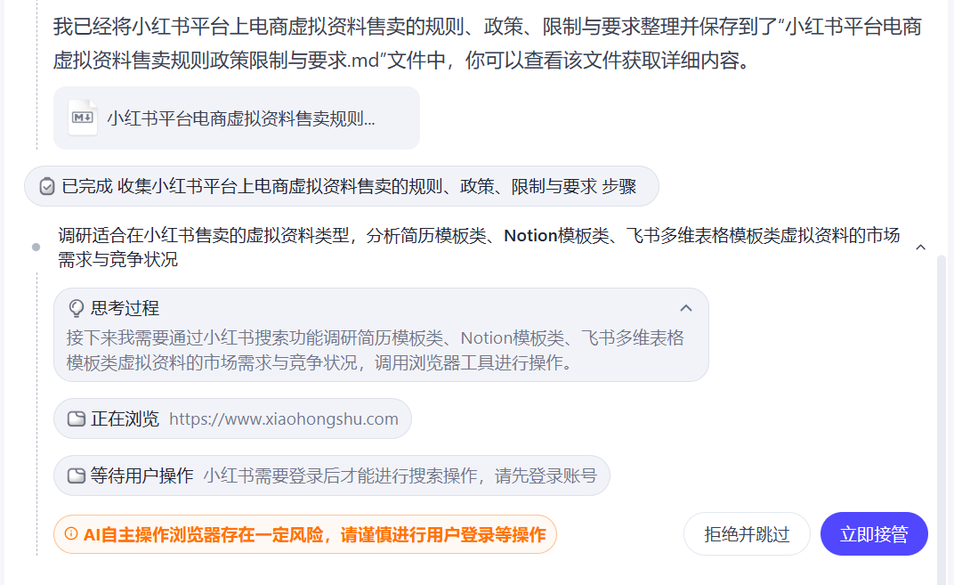 然后后面就开始一系列自己调研的操作了。相比之前的功能,现在当扣子空间遇到需要浏览器搜索的时候,会提醒进行授权。