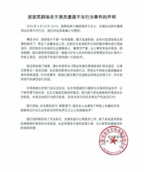对此,波波笑剧场相关负责人告诉央广网记者,称经过相关部门核查,演出内容符合《营业性演出管理条例》相关规定,女演员穿着为一条连衣裙,未发现有影响公序良俗行为,男观众手伸进去裙底触碰女演员身体底线;针对该事件,剧场已配合警方完成取证和依法处理工作,并对受到惊吓的演员进行安抚。剧场方面表示,后续会继续保护演员的合法权益,对违法违规行为绝不姑息,坚决支持司法机关依法严惩违法行为。