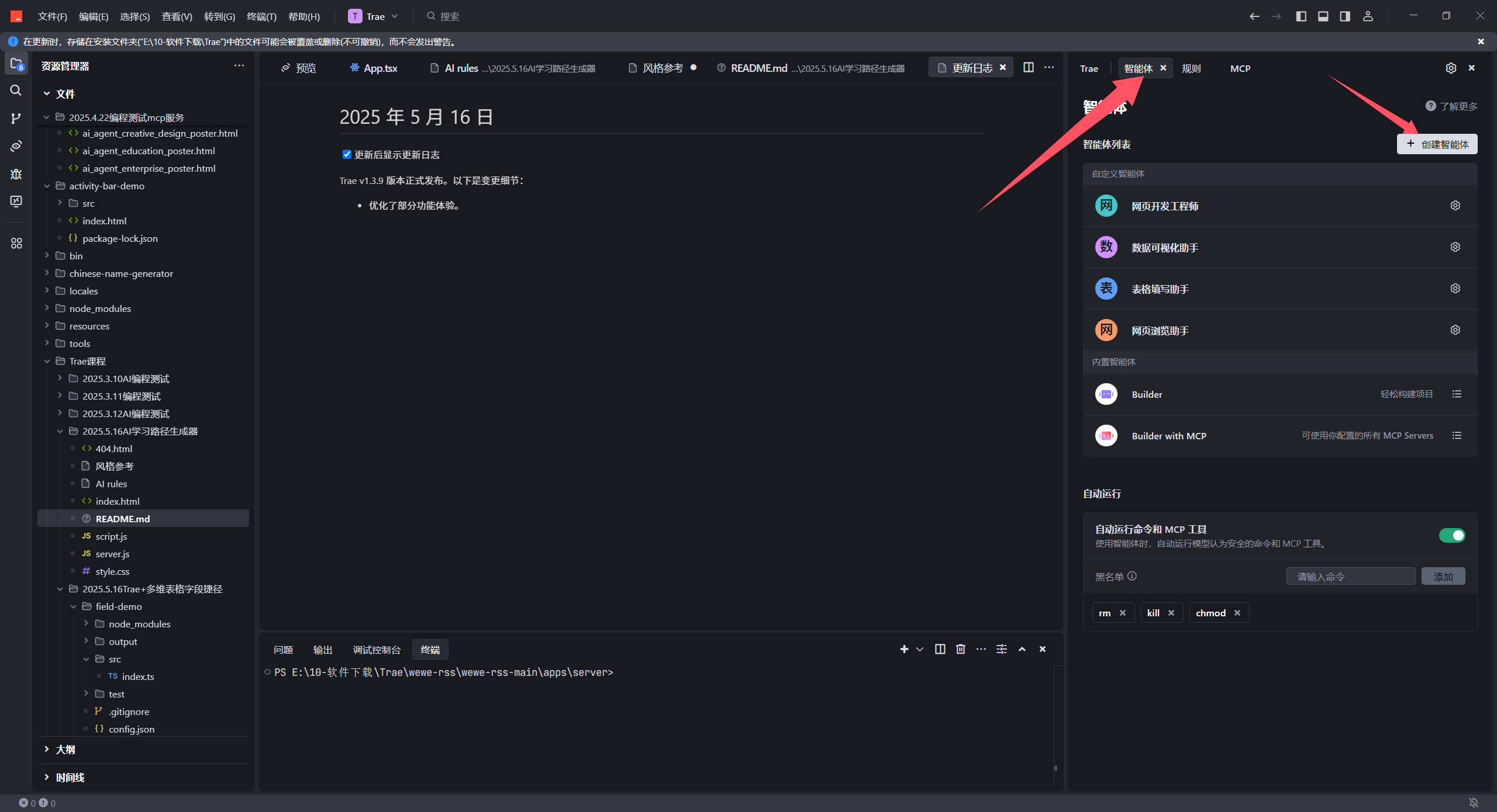 今天分享trae上线的智能体功能,能够让我们把智能体和编程结合起来,搞定更多复杂的任务,并且还有mcp协议的接入,意味着后续可以和更多的软件联动,真的是太绝了。