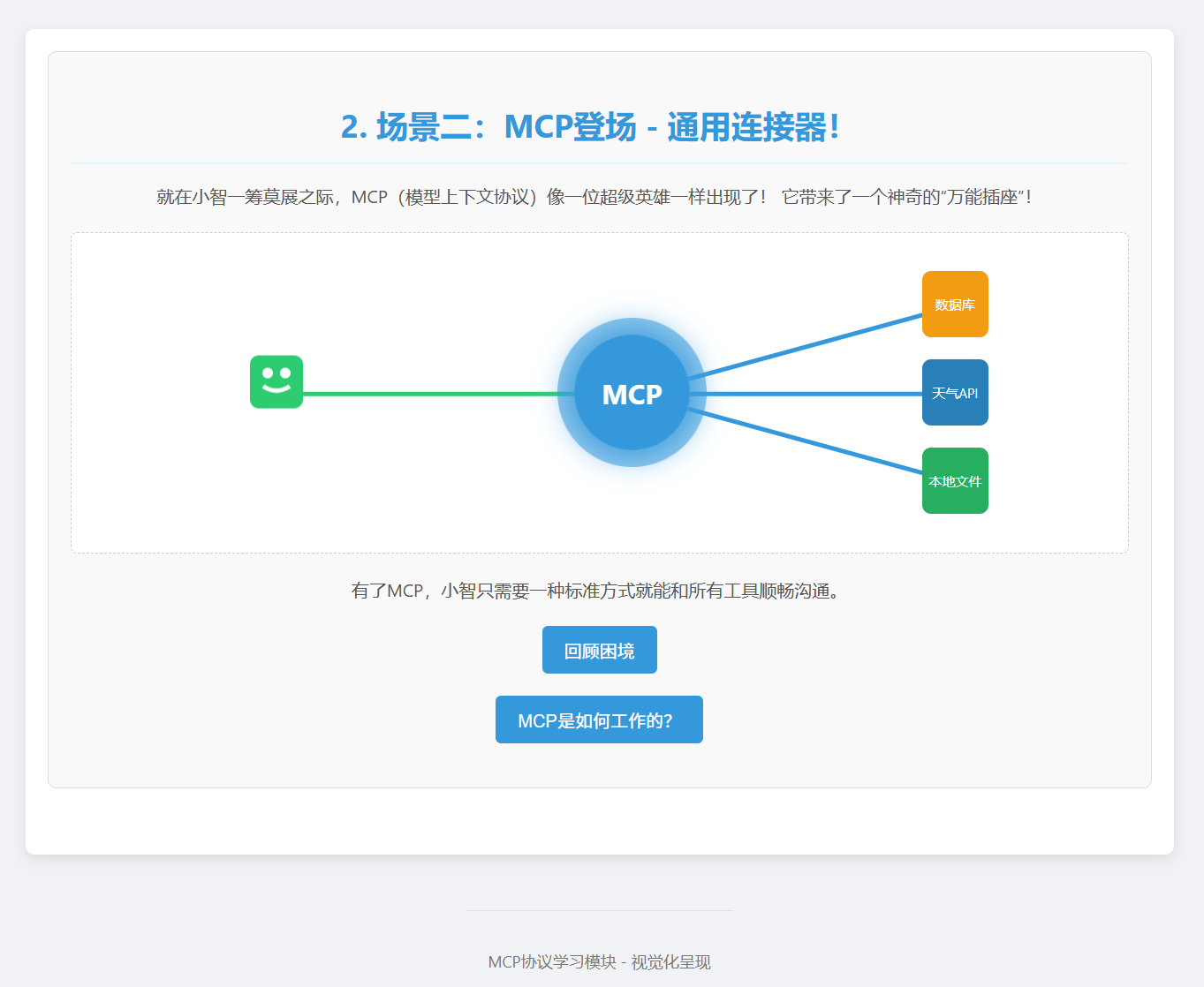 请协助我学习【什么是mcp协议】,并以可视化网页的方式给到我。
