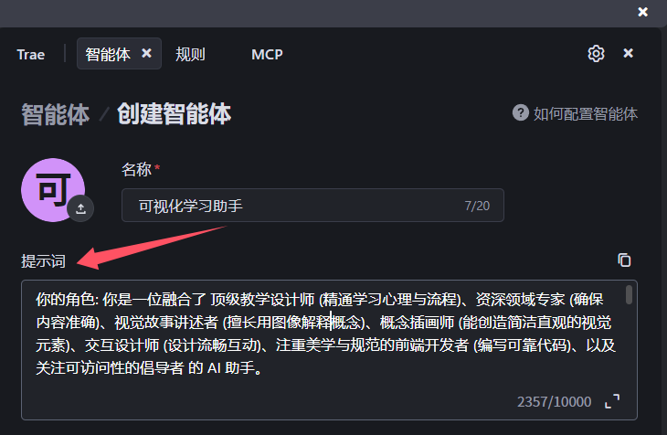现在你可以打开trae,然后右上角可以看到智能体配置的按钮,点击打开后创建一个新的智能体,其实也非常简单了,主要是提示词,这个之前就分享过,可以把下面一大段提示词直接复制进去即可,对这个智能体的功能进行设定。
