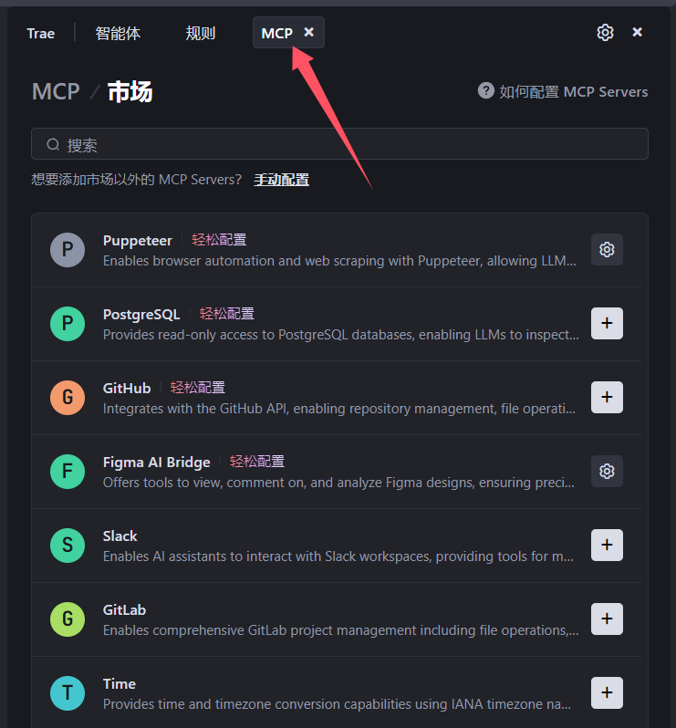 其他需要的可以自行点击右上角的mcp功能按钮,在市场当中自行选择。因为我下载的是国际版的trae,所以其实很多国外软件是用不上的。