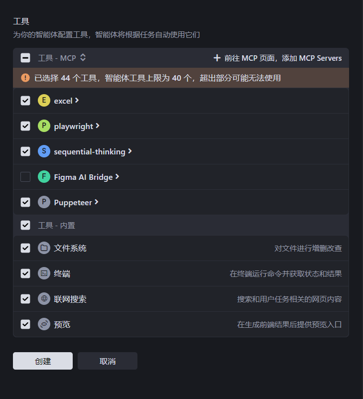 然后既然是智能体,肯定不止一个功能,所以下面要配备mcp工具,让它可以成为“多功能”的瑞士军刀。