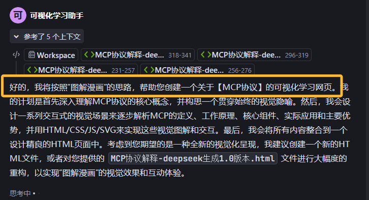 添加完成之后,点击确定就可以在主页看到你可以基于可视化学习助手进行对话协作了,右下角选择编程牛逼的gemini2.5,然后输入提示词,你想让它解释的概念: