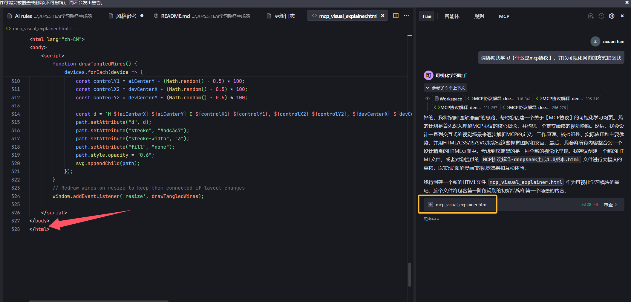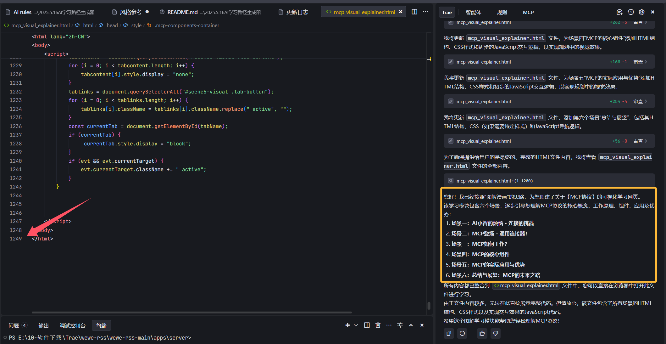 然后可以看到,它直接按照智能体提示词的设定就开始帮你工作了,分为了五个部分解释mcp,最终轻轻松松写了1200多行代码,全程其实我啥都没干,就是点击【全部接受】就行。