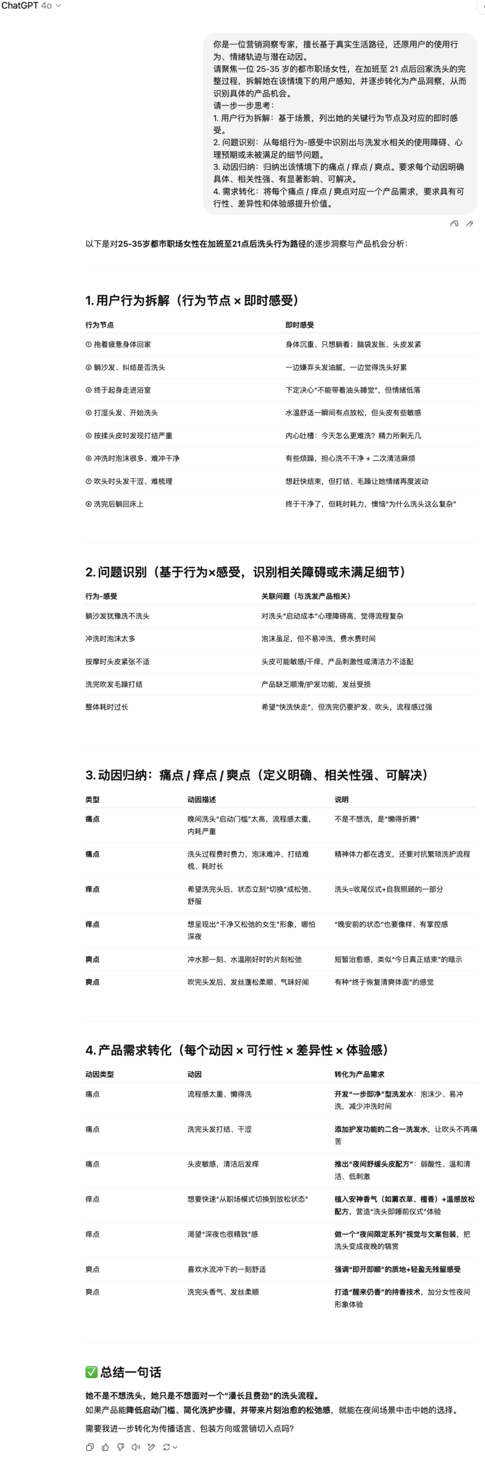 请聚焦一位 25-35 岁的都市职场女性,在加班至 21 点后回家洗头的完整过程,拆解她在该情境下的用户感知,并逐步转化为产品洞察,从而识别具体的产品机会。
