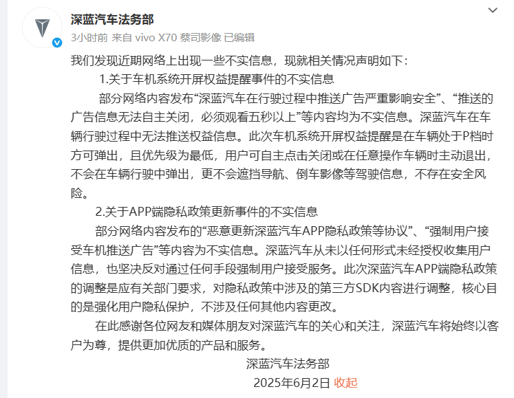 据大河财立方,6月2日,深蓝汽车法务部通过微博发布声明称,部分网络内容发布“深蓝汽车在行驶过程中推送广告严重影响安全”“推送的广告信息无法自主关闭,必须观看五秒以上”等内容均为不实信息。