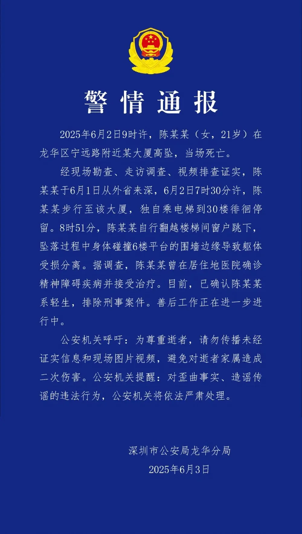 据北京日报,6月3日晚间,深圳市公安局龙华分局通报:2025年6月2日9时许,陈某某(女,21岁)在龙华区宁远路附近某大厦高坠,当场死亡。