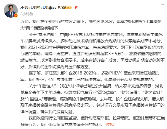据财联社,比亚迪品牌及公关处总经理李云飞今日微博发文称,近期,我们在个别同行的推波助澜下,深陷舆论风波,现就“常压油箱”和“车圈恒大”两个话题说明如下: