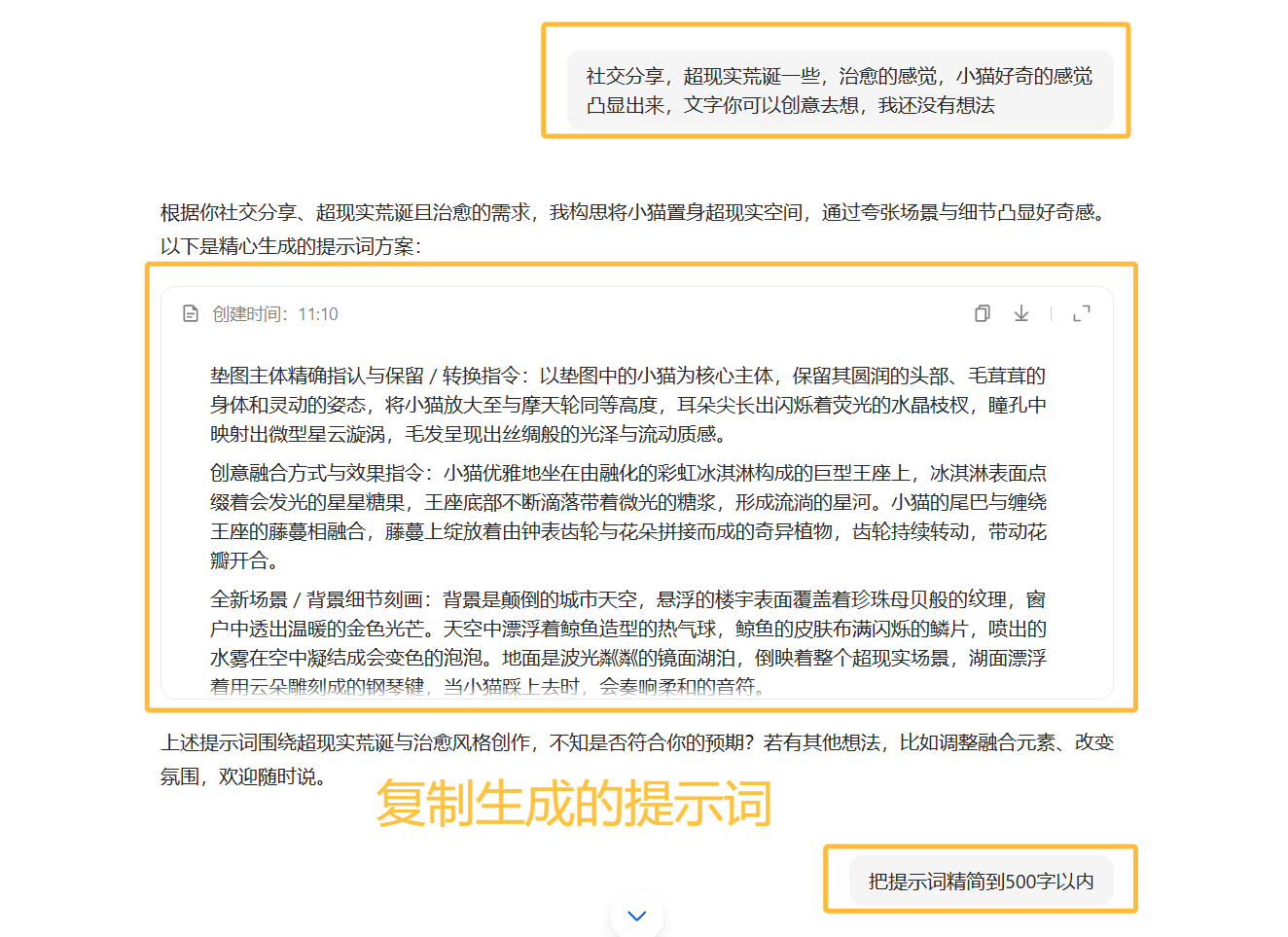可以看到截图当中已经有了第一版提示词,不过即梦现在最多只能输入500字,所以可以要求她精简到500字。