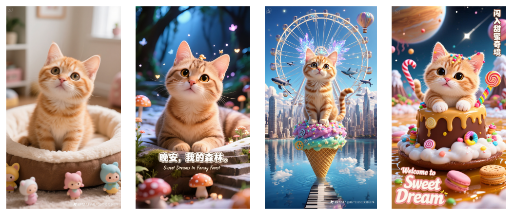 以垫图小猫为核心,保留圆润头部与灵动姿态,放大至摩天轮高度。耳朵长出荧光水晶枝杈,瞳孔映出微型星云,毛发呈丝绸光泽质感。