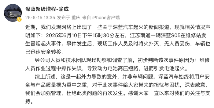 据界面新闻,6月15日,深蓝汽车超级增程负责人喻成在微博发布声明称,2025年6月10日下午15时30分左右,江苏南通一辆深蓝S05在维修站发生冒烟起火事件。事件发生后,现场工作人员及时将火扑灭,无人员受伤,车辆也已迅速安全转移。经公司人员和技术团队现场勘察和调查了解,初步判断该次事件原因为:维修人员作业过程中操作失误,导致动力电池高压短路,进而引发电池起火。综上所述,这是一起外力导致的意外,并非车辆问题。