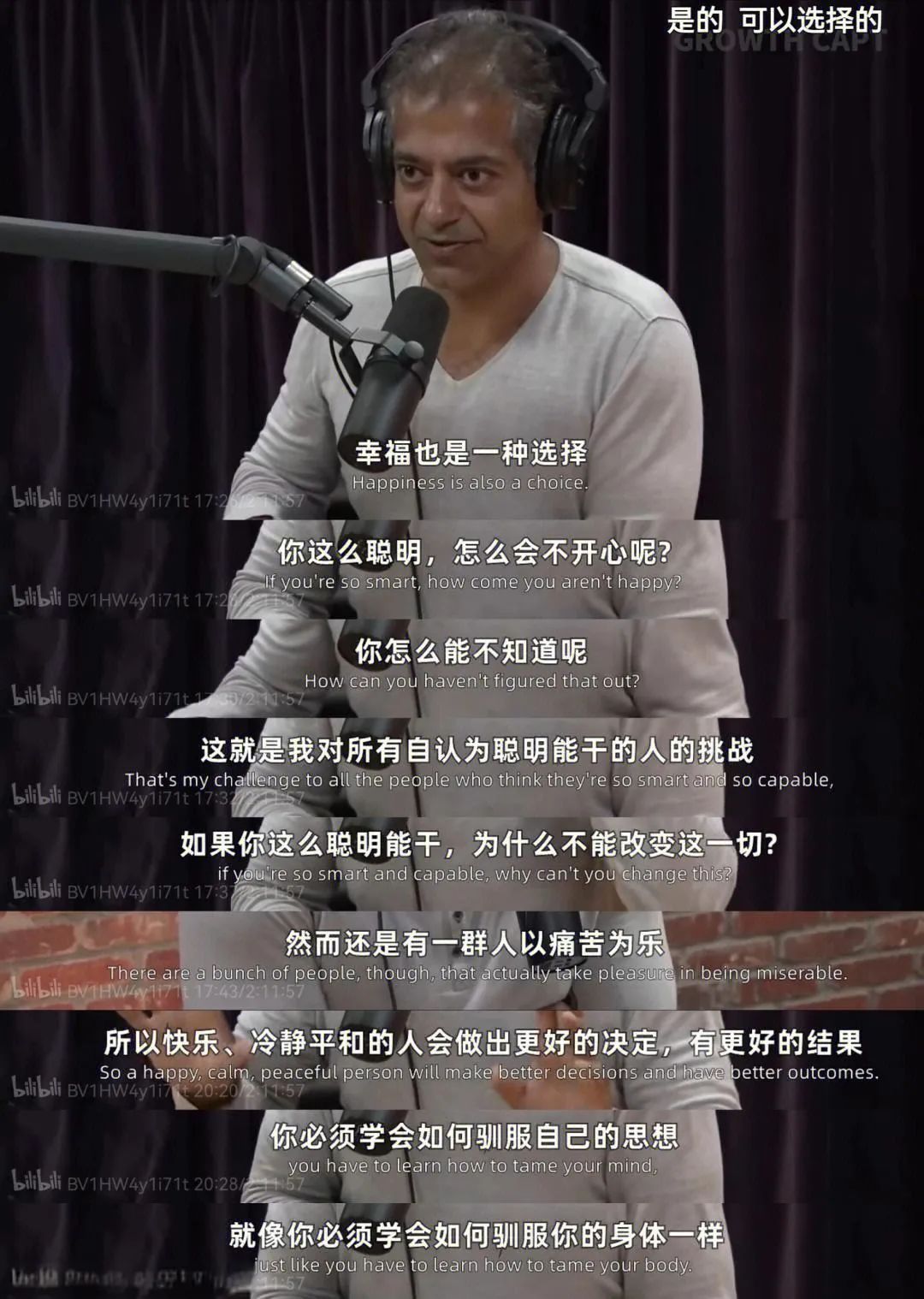 同样他谈及需要避免那些悲观的人,原文采访中,他提到在原始社会或者说一个部落中,如果你因婚姻失败而分手,那么很有可能在这个部落中剩余的20个人不会是你的选择。但现代社会,你拥有的杠杆或资源很多,一个小小的分手并不会被视作失败,因为你有更多的工具能够遇到更多人。不要停留在短暂的失败中,而要从中吸取教训或者学习到什么。就好像马尔科姆的10000小时定律一样,重复地做一件事情并不会让你取得成功,但每次尝试中的纠偏可以。