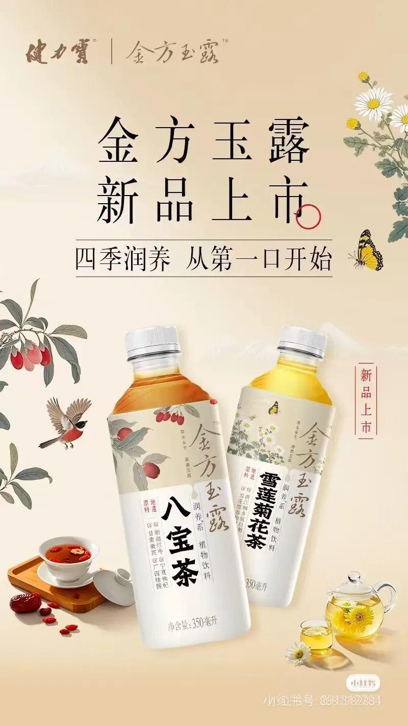 近日,健力宝推出两款植物饮料:「金方玉露八宝茶」和「金方玉露雪莲菊花茶」。据介绍,产品以药食同源草本为原料,并采用UHT超高温瞬时杀菌保留原料本身营养成分和风味,主打“0糖0脂0添加色素和香精”概念。其中,金方玉露八宝茶添加新疆和田红枣、甘肃定西黄芪、宁夏中卫枸杞、广西桂圆、云南滇红茶、山东济南重瓣玫瑰和苹果汁八大地道食材,入口醇滑清润;金方玉露雪莲菊花茶搭配天山雪莲培养物和浙江桐乡杭白菊双重草本精粹,口感清爽甘甜。
