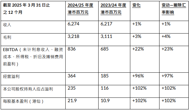 6月24日,维他奶国际(VITASOY INT'L)发布截至2025年3月31日止2024/2025年度全年业绩公告,报告期内实现收入约为62.74亿港元(折合人民币约57.31亿元),同比增长1%;实现毛利约为32.18亿港元,同比增长3%;实现公司股权持有人应占溢利约为2.35亿港元,同比增长102%。