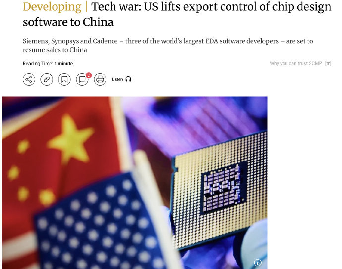 另据《南华早报》援引西门子、新思科技(Synopsys)和楷登电子(Cadence)公司发布的声明称,美国政府已于本周四取消对中国部分芯片设计软件的出口管制措施。三家全球领先的电子设计自动化(EDA)软件开发商均表示,未来其相关产品出口至中国将无需获得特别批准。