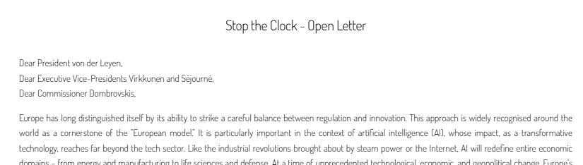 这封公开信发布在“欧盟人工智能冠军倡议”网站上,落款中有接近50个欧洲企业的高管,包括空客、阿斯麦、罗氏、梅赛德斯-奔驰等,以及Mistral、ElevenLabs等AI公司。