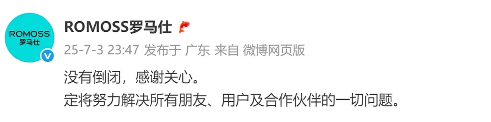 据现代快报,7月3日,针对“倒闭”传言,ROMOSS罗马仕发布消息:没有倒闭,感谢关心。定将努力解决所有朋友、用户及合作伙伴的一切问题。