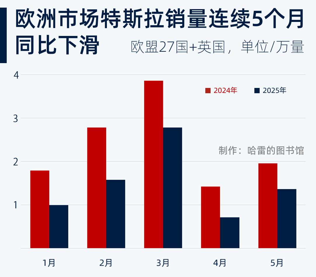 柏林郊外的格伦海德工厂,在最高峰期这里曾经每周诞生5000辆Model Y,如今却因为特斯拉在欧洲市场的困局而陷入沉寂。2025年5月,特斯拉在欧洲市场遭遇连续第5个月的销量下滑:新车销量同比2024年暴跌27.9%,市场份额从2024年同期的1.8%萎缩至1.2%。更具反差感的是,同期欧洲电动车市场却增长了27.2%,马斯克仿佛是这场喧闹宴席中唯一的缺席者。随着⼤众、宝⻢、奥迪和中国品牌不断占据欧洲市场份额,特斯拉失去了长久以来作为顶级电动汽⻋品牌的地位。