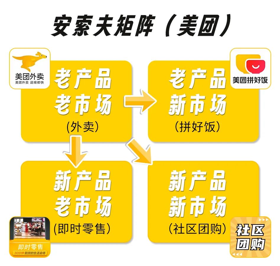 甚至,从这个矩阵中都可以理解为何社区团购美团没有打赢。逻辑上讲,拼好饭和即时零售对美团来讲都是“迈一步”,要么是老产品进到新市场,要么是新产品进入老市场。