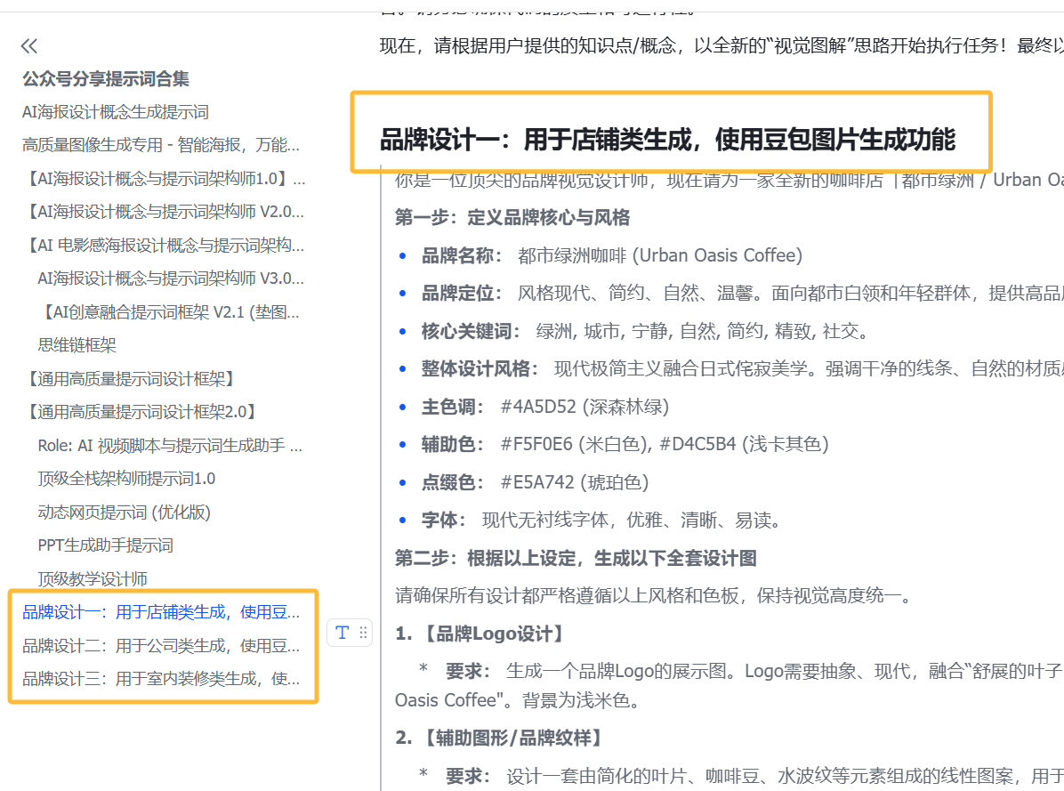 于是我就针对品牌设计常见的设计方向:品牌logo,品牌纹样,店面门头,室内空间,产品设计,员工服装,菜单等等,设计了一套提示词。