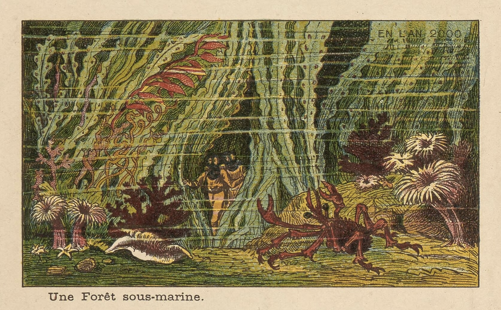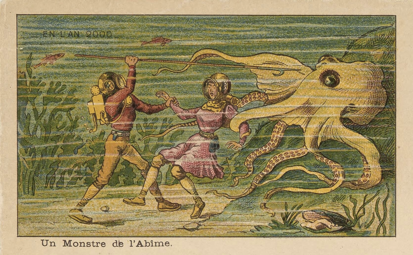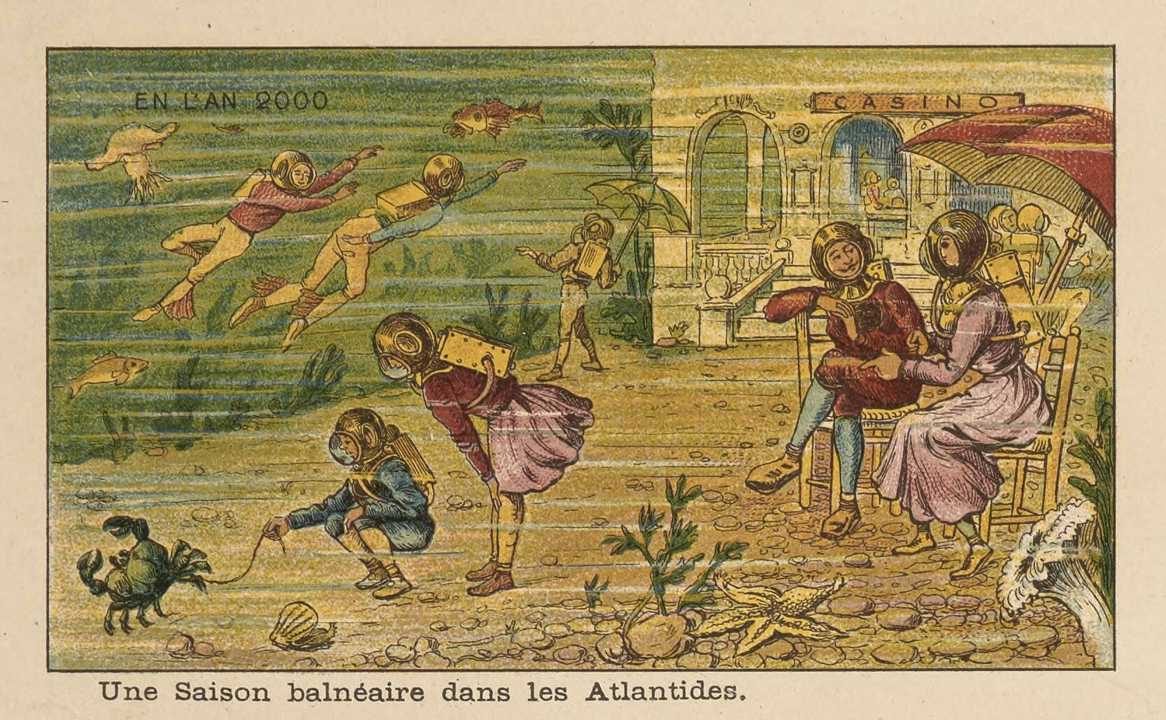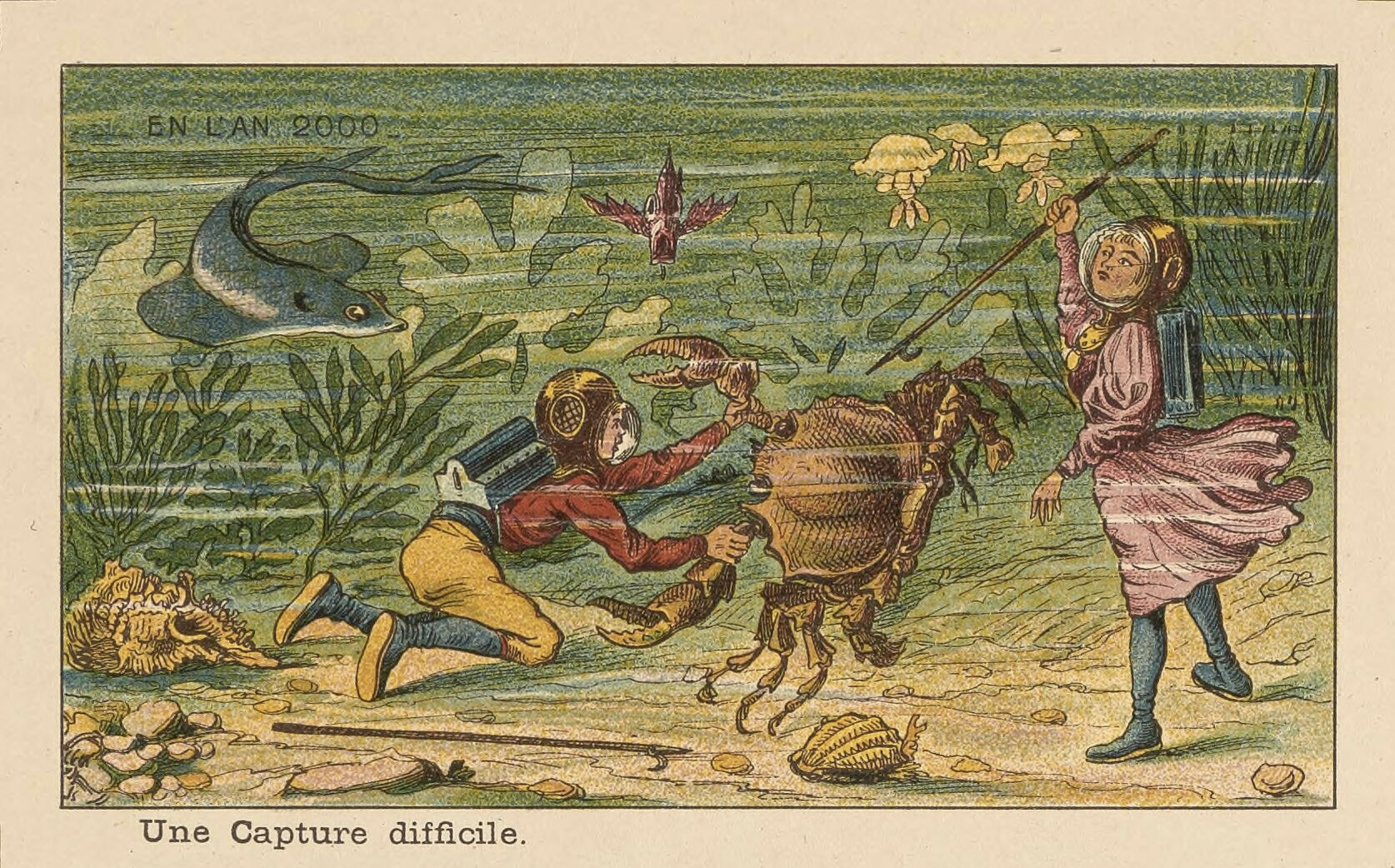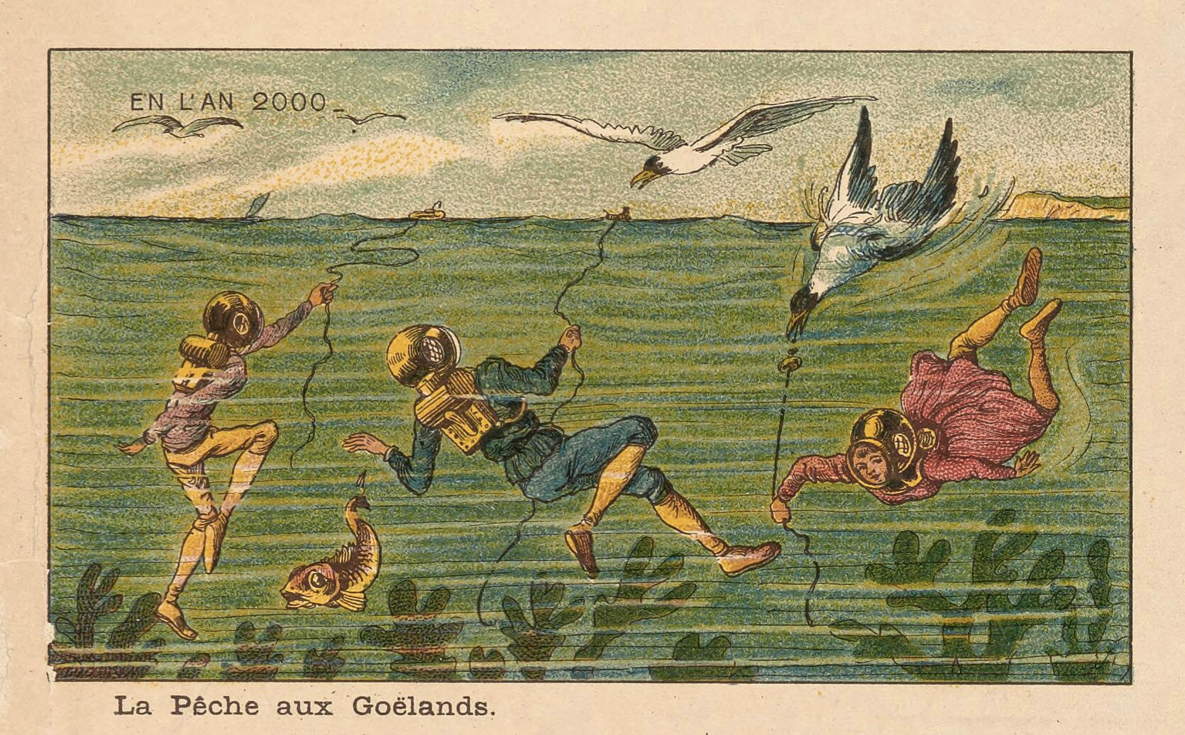 值得一提的是,这组卡片的很多幻想围绕着海洋生活展开,潜水员捕捉海鸥、水底散步、建造海底城市等设想,反映了人类试图把地面文明复制到未知空间的冲动,而这种冲动和当时西方帝国主义提倡扩张、征服的观念相互呼体现了当时西方的时代精神精神。