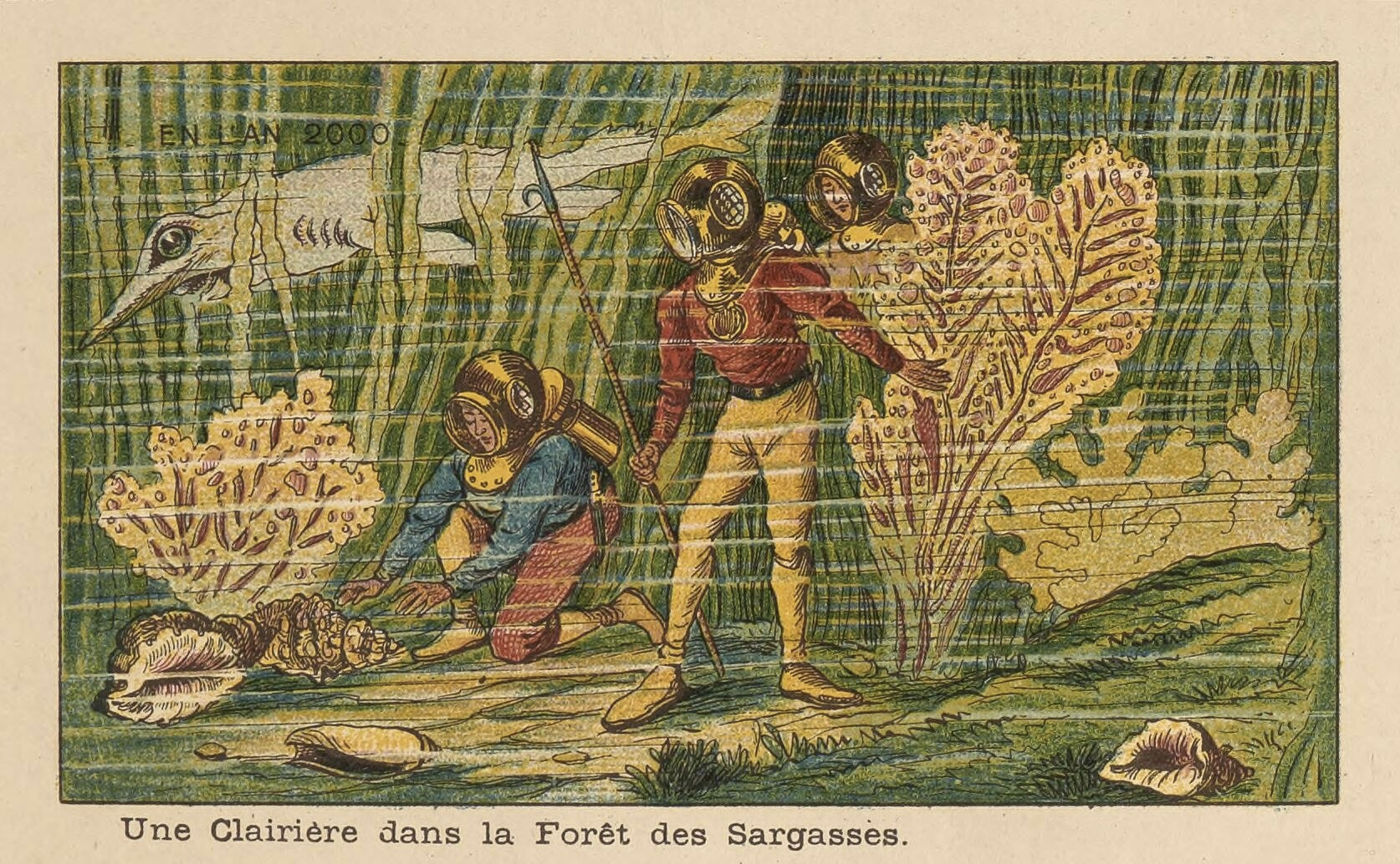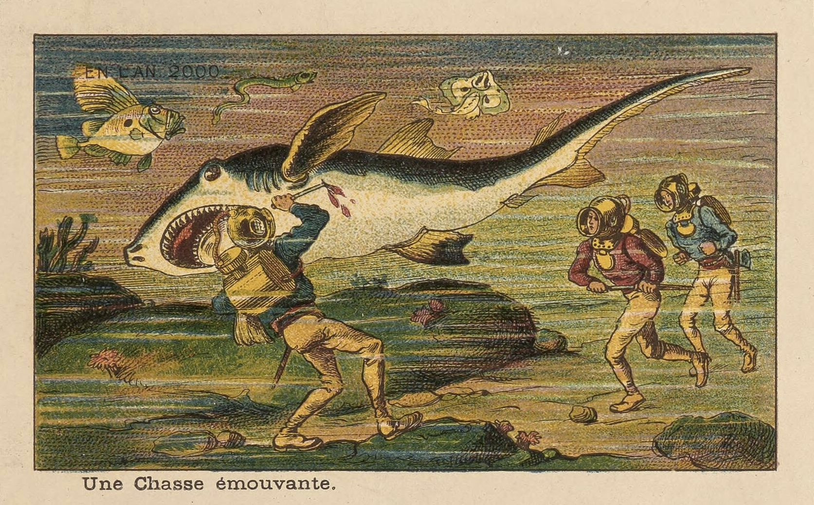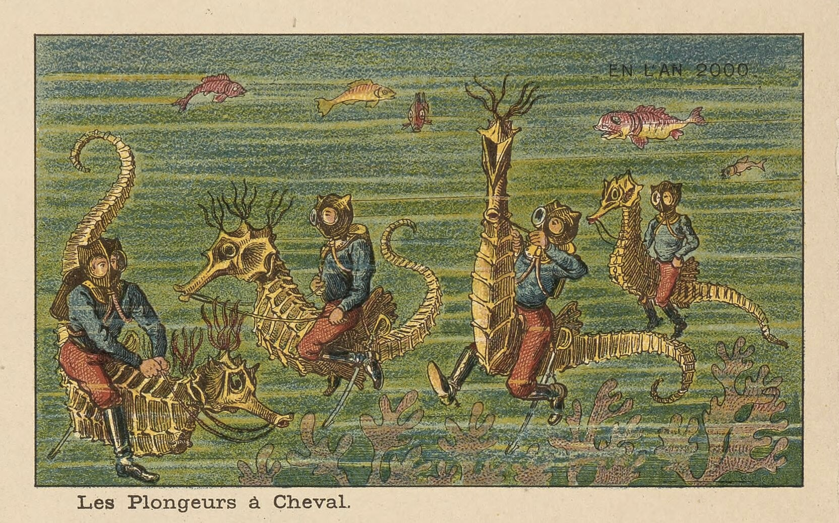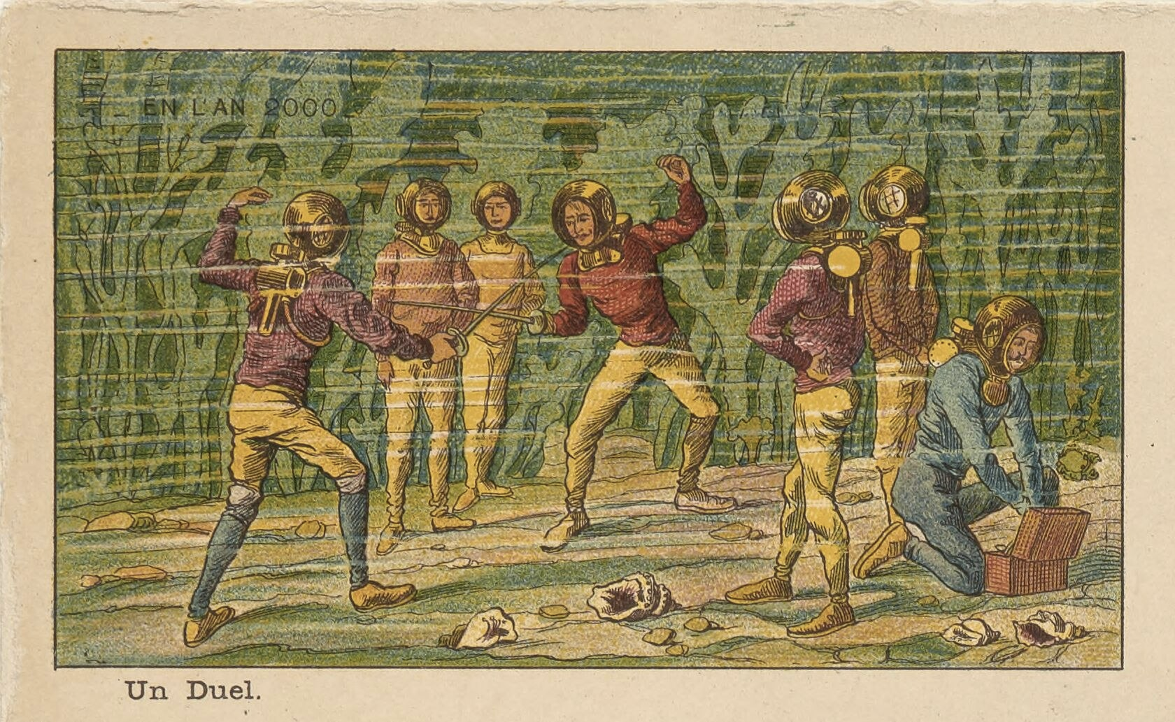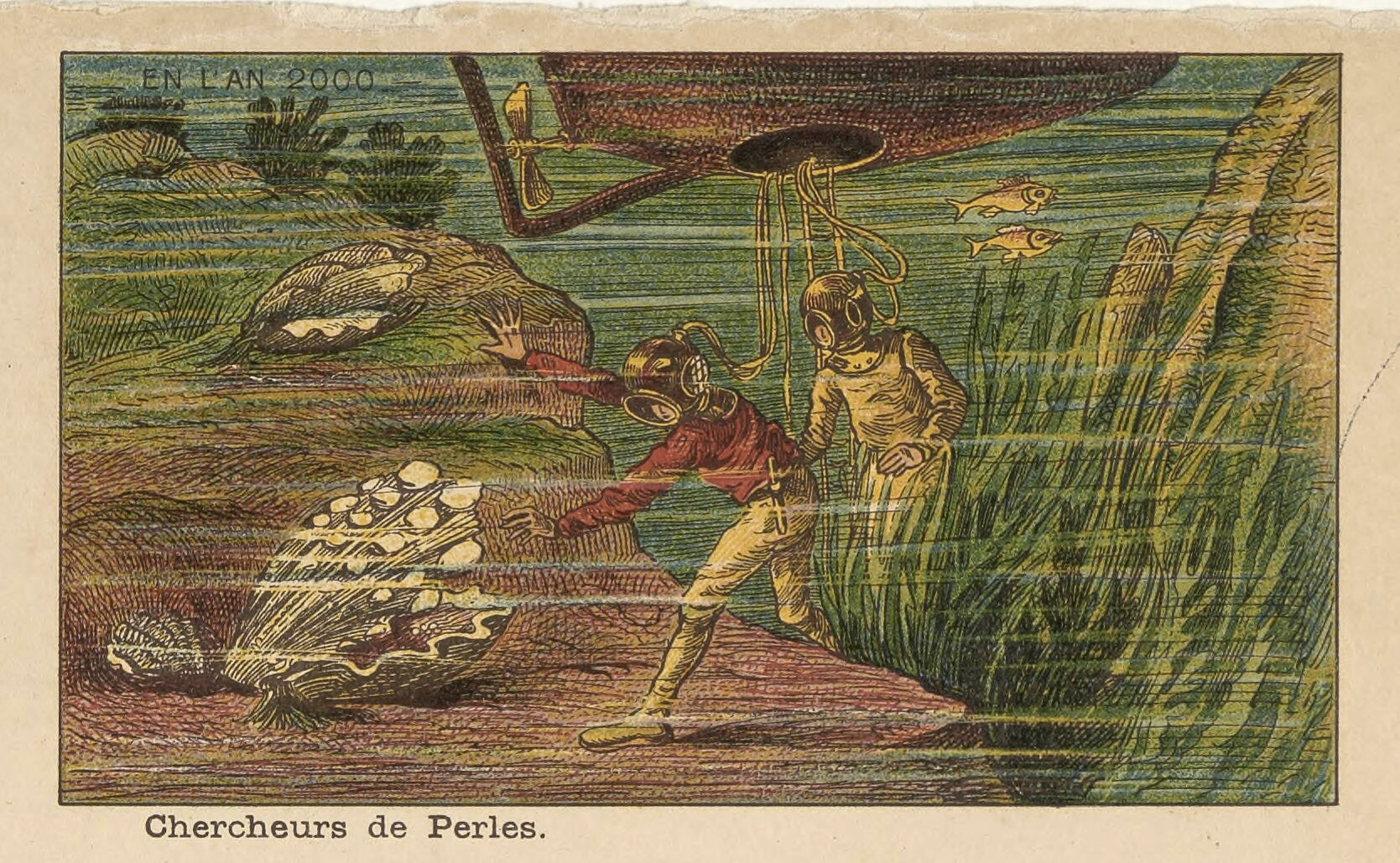 值得一提的是,这组卡片的很多幻想围绕着海洋生活展开,潜水员捕捉海鸥、水底散步、建造海底城市等设想,反映了人类试图把地面文明复制到未知空间的冲动,而这种冲动和当时西方帝国主义提倡扩张、征服的观念相互呼体现了当时西方的时代精神精神。