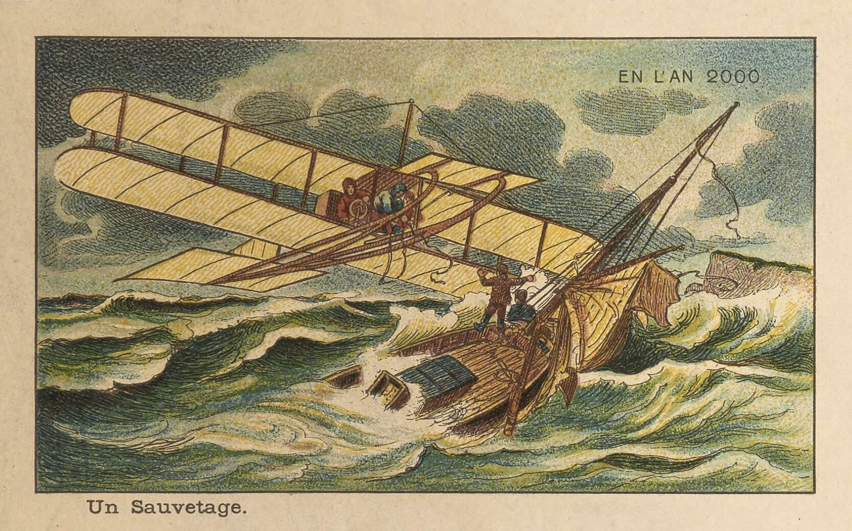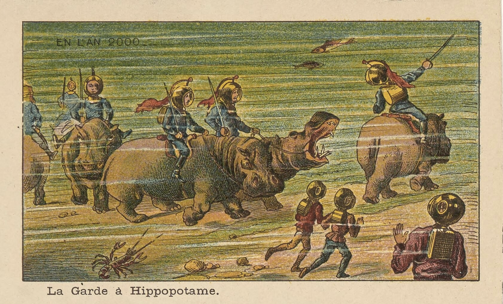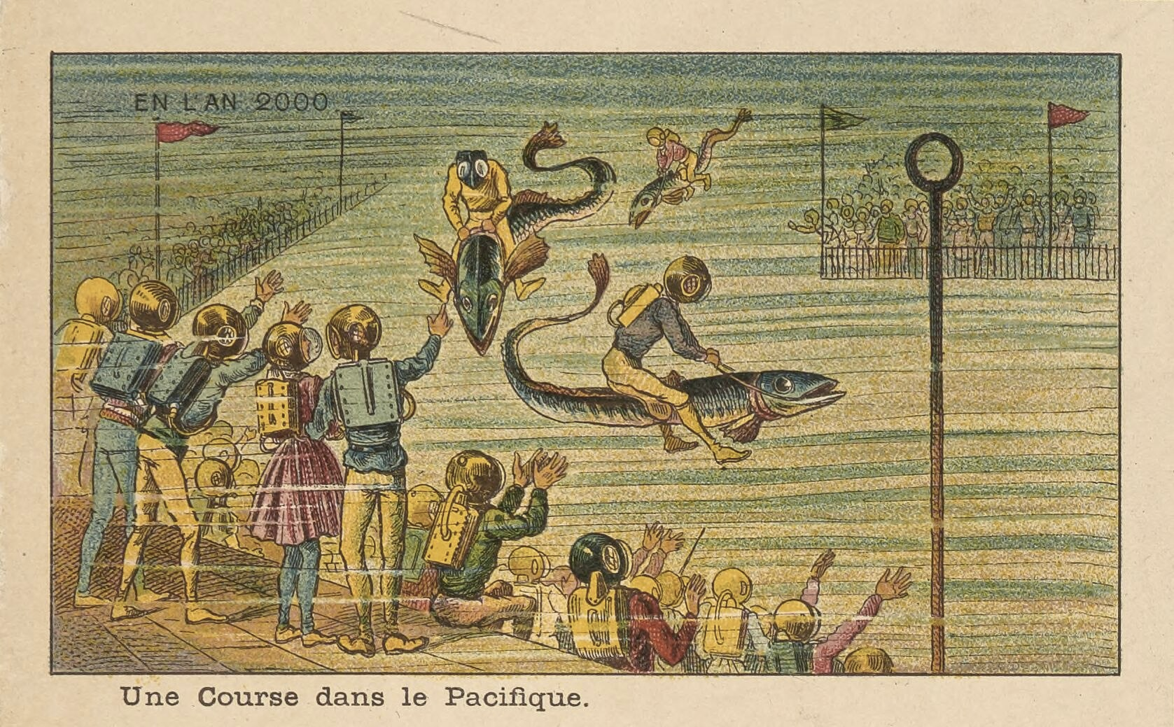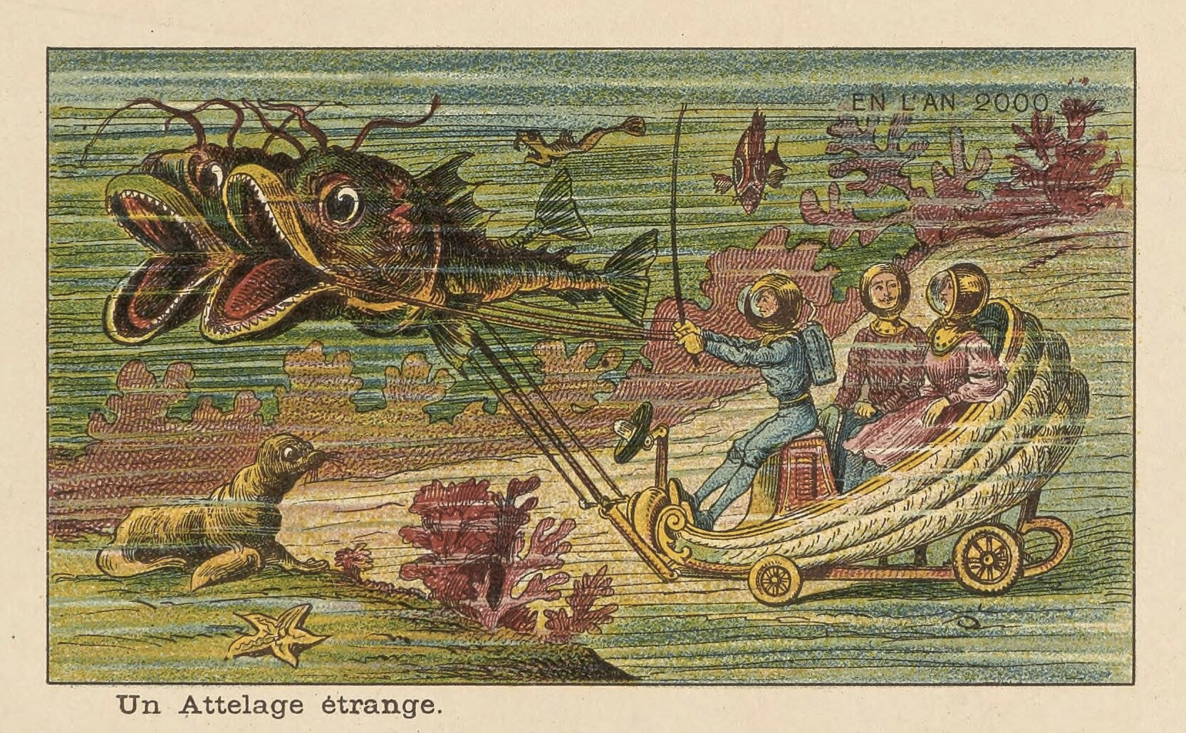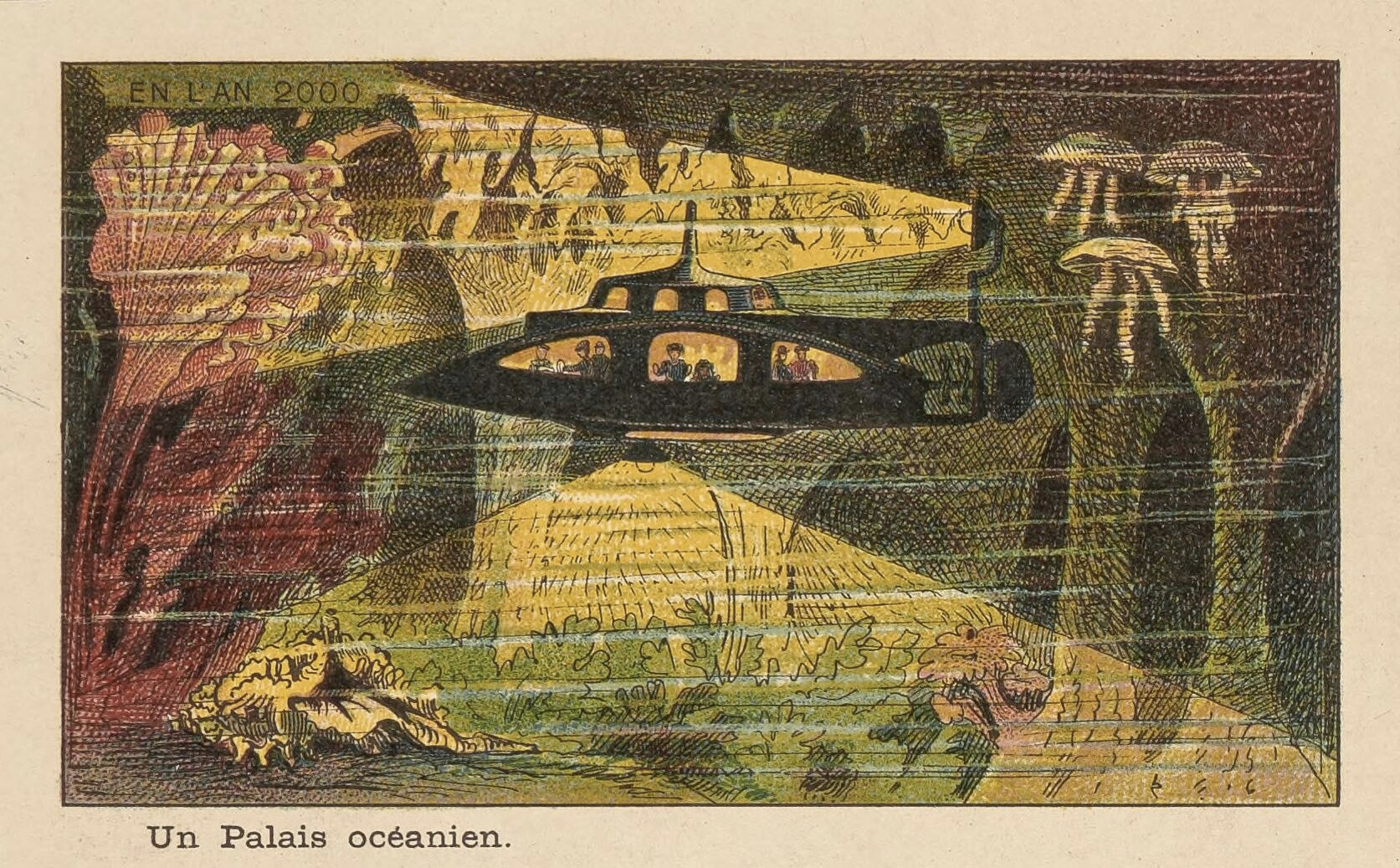 值得一提的是,这组卡片的很多幻想围绕着海洋生活展开,潜水员捕捉海鸥、水底散步、建造海底城市等设想,反映了人类试图把地面文明复制到未知空间的冲动,而这种冲动和当时西方帝国主义提倡扩张、征服的观念相互呼体现了当时西方的时代精神精神。