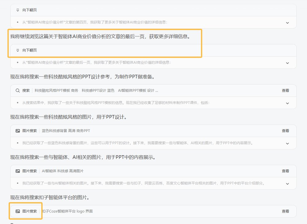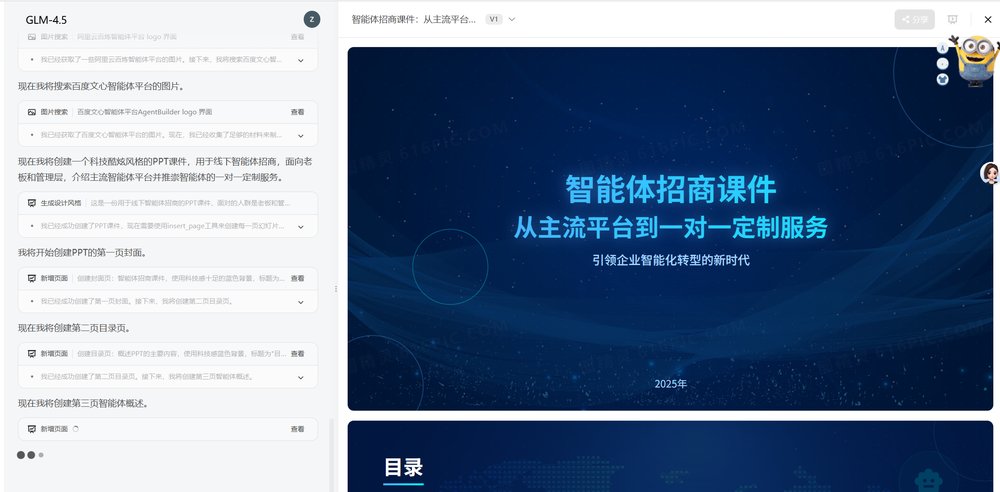 还有智谱新的4.5模型本身就是智能体,所以它在制作过程中就直接把搜索,搜图融入进去了,可以看到最后的ppt效果,里面的图片都是搜集好直接插入进去的。