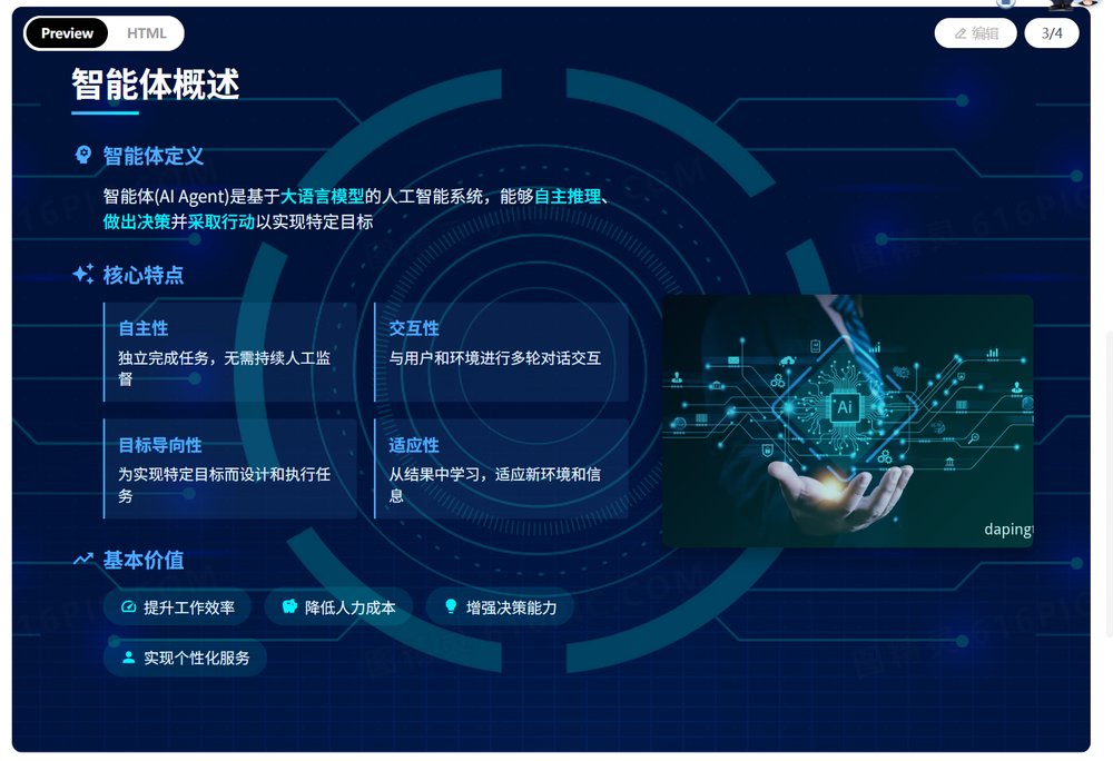 最近智谱升级4.5模型之后,写代码能力是突飞猛进,所以这里的制作ppt仍然是写代码的方式,出来的效果确实是要比扣子空间还要好一些的。