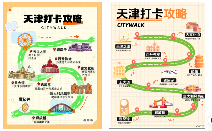 可以看看第一个天津旅游攻略海报的模仿效果: