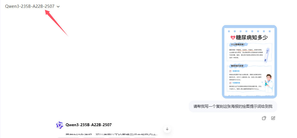 丢进qwen当中,选择qwen235b的那个模型,然后输入提示词,让它识别图片并拆解为设计提示词:
