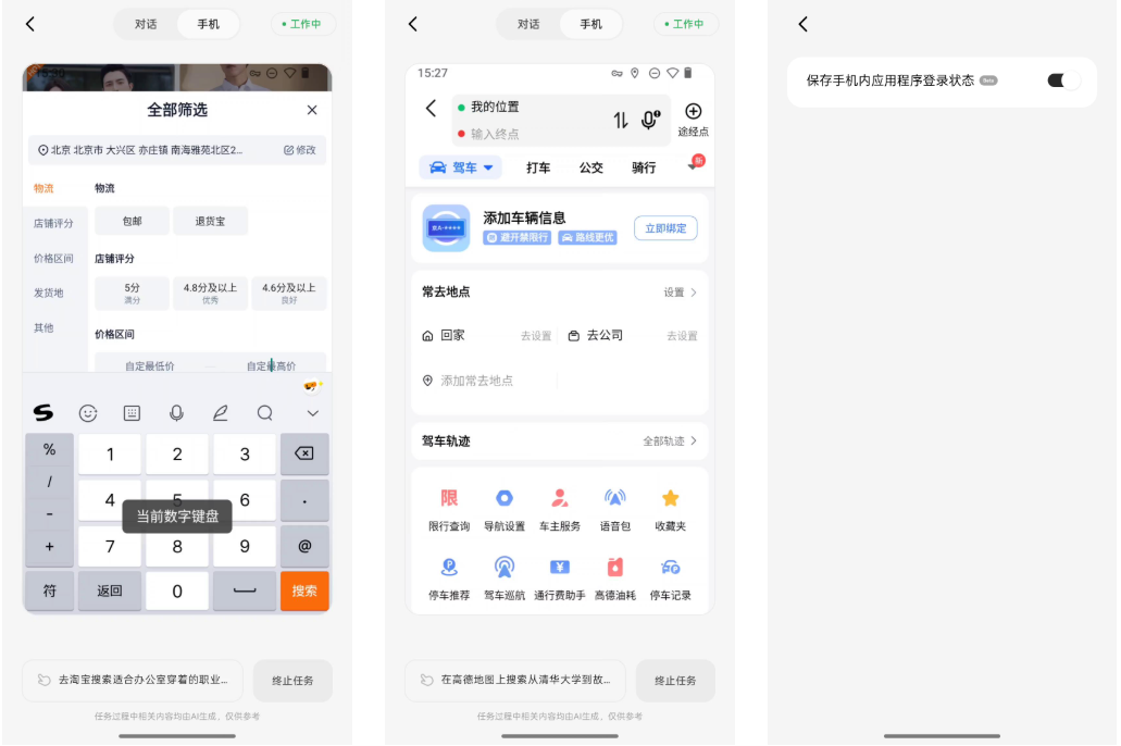 它就启动了一个虚拟机,然后开始操作帮你看导航定位,打车,全程都是自主操作完成的,遇到第一次使用应用会登录授权一下。