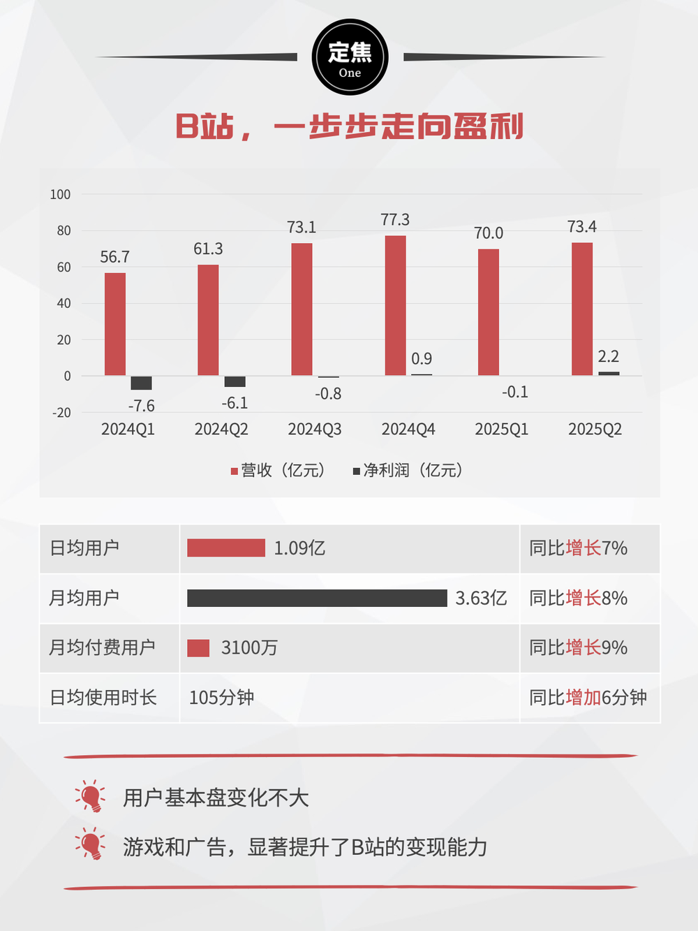 用户方面,二季度,B站日均活跃用户数达1.09亿,同比增长7%;月均活跃用户数达3.63亿,同比增长8%;月均付费用户达3100万,同比增长9%。二季度,B站用户日均使用时长达105分钟,较去年同期增长6分钟。