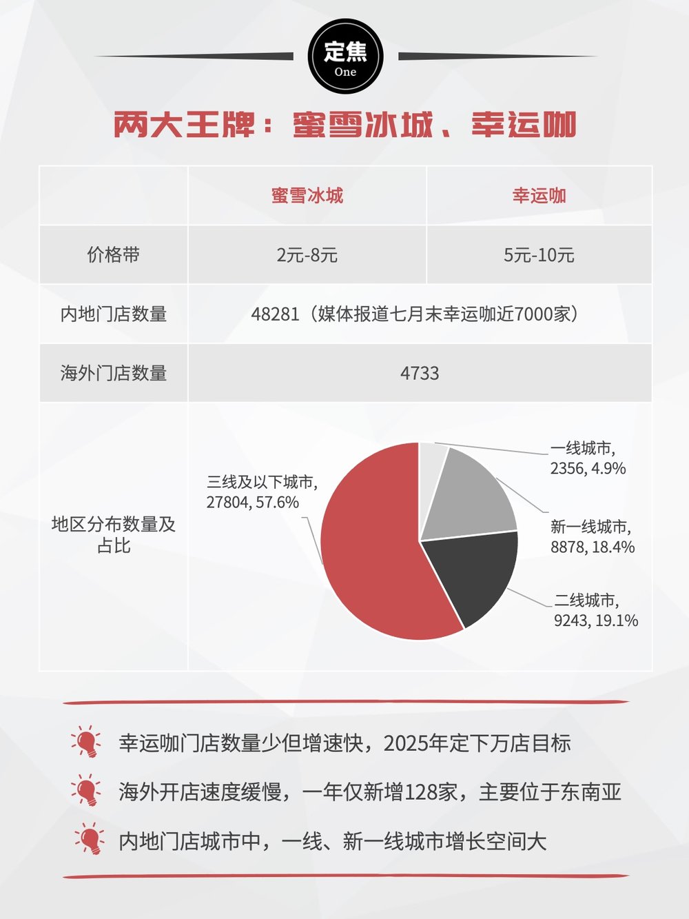 目前蜜雪集团主要有两大品牌——卖奶茶的蜜雪冰城与卖咖啡的幸运咖,幸运咖是重要增长引擎,定下了今年冲万店的目标。