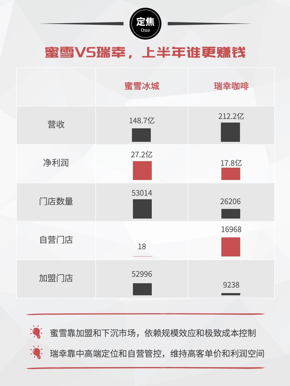 瑞幸同样位于国内咖啡茶饮第一梯队,与蜜雪集团存在一定的竞争关系。上半年,蜜雪在净利润和门店数量上占优势,但营收和单店利润不及瑞幸,这主要因为两家的战略不太一样,蜜雪靠加盟和下沉市场,依赖规模效应和极致成本控制,瑞幸靠中高端定位和自营管控,维持高客单价和利润空间。